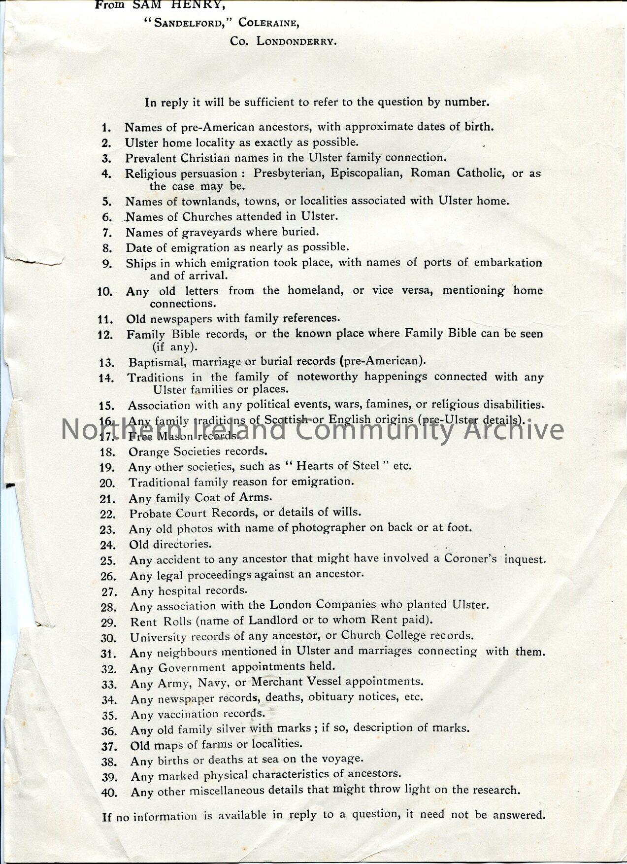 Printed genealogical questionnaire by Sam Henry, Sandelford, Coleraine, Co. Londonderry. List of 40 questions.