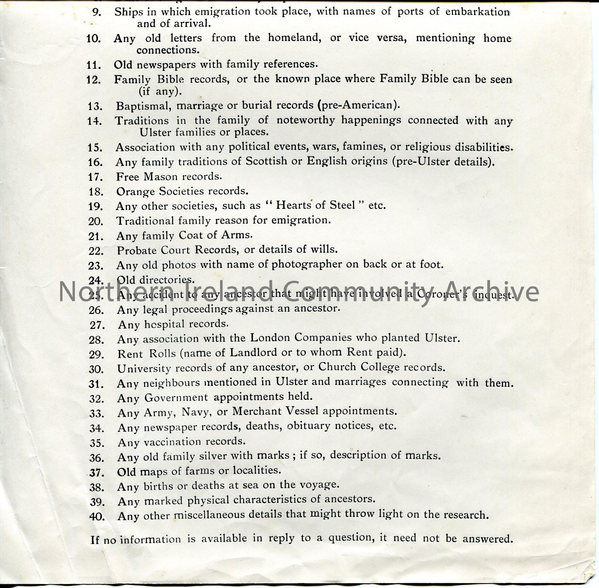 Printed genealogical questionnaire by Sam Henry, Sandelford, Coleraine, Co. Londonderry. List of 40 questions. – scan044b