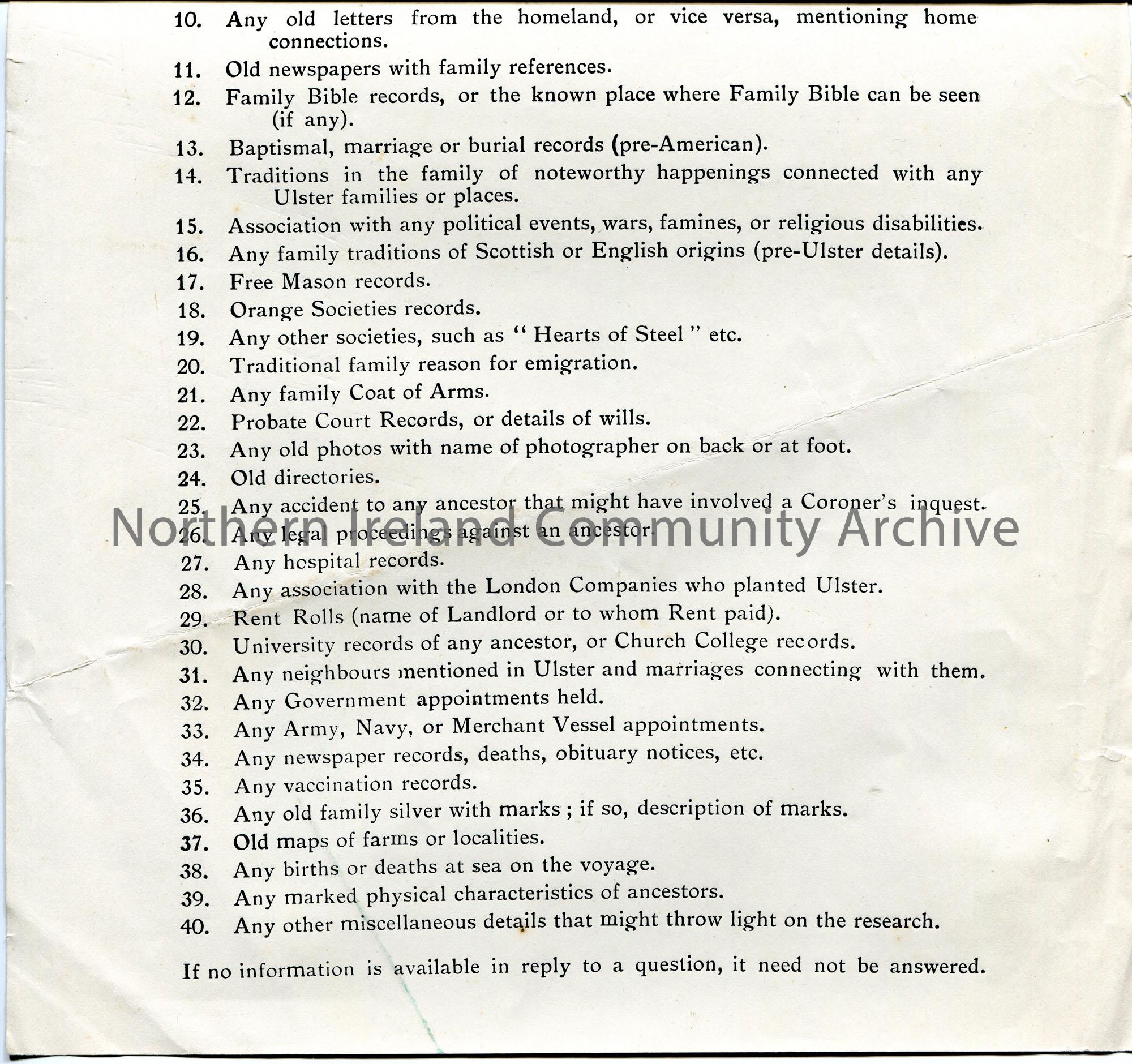 Printed genealogical questionnaire by Sam Henry, Sandelford, Coleraine, Co. Londonderry. List of 40 questions. – scan045b