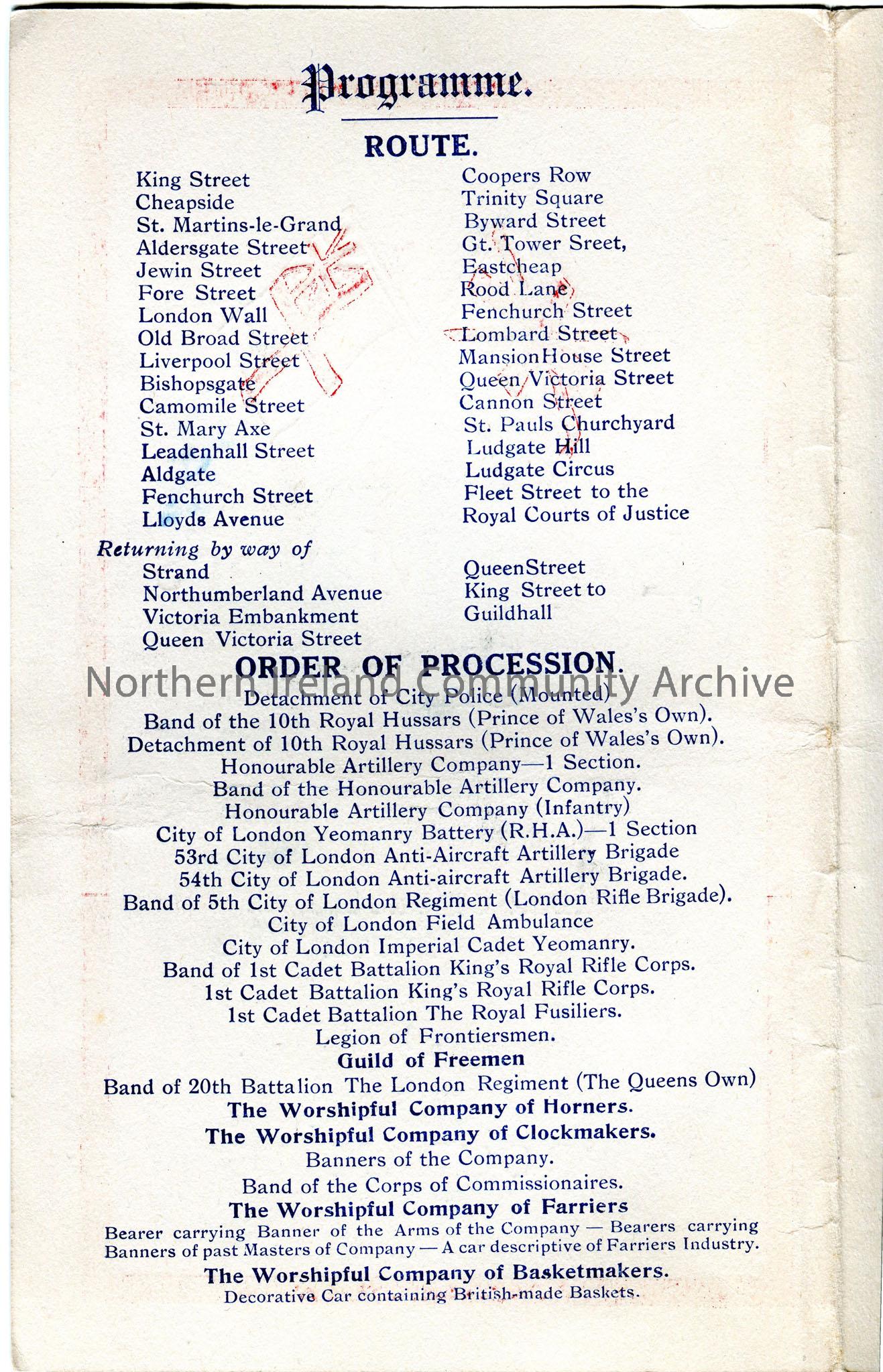 Printed (in colour) booklet for programme of Lord Mayor’s Show on 9th November. Mayor Sir Charles Albert Batho. Order of procession and route. Union J… – scan140b