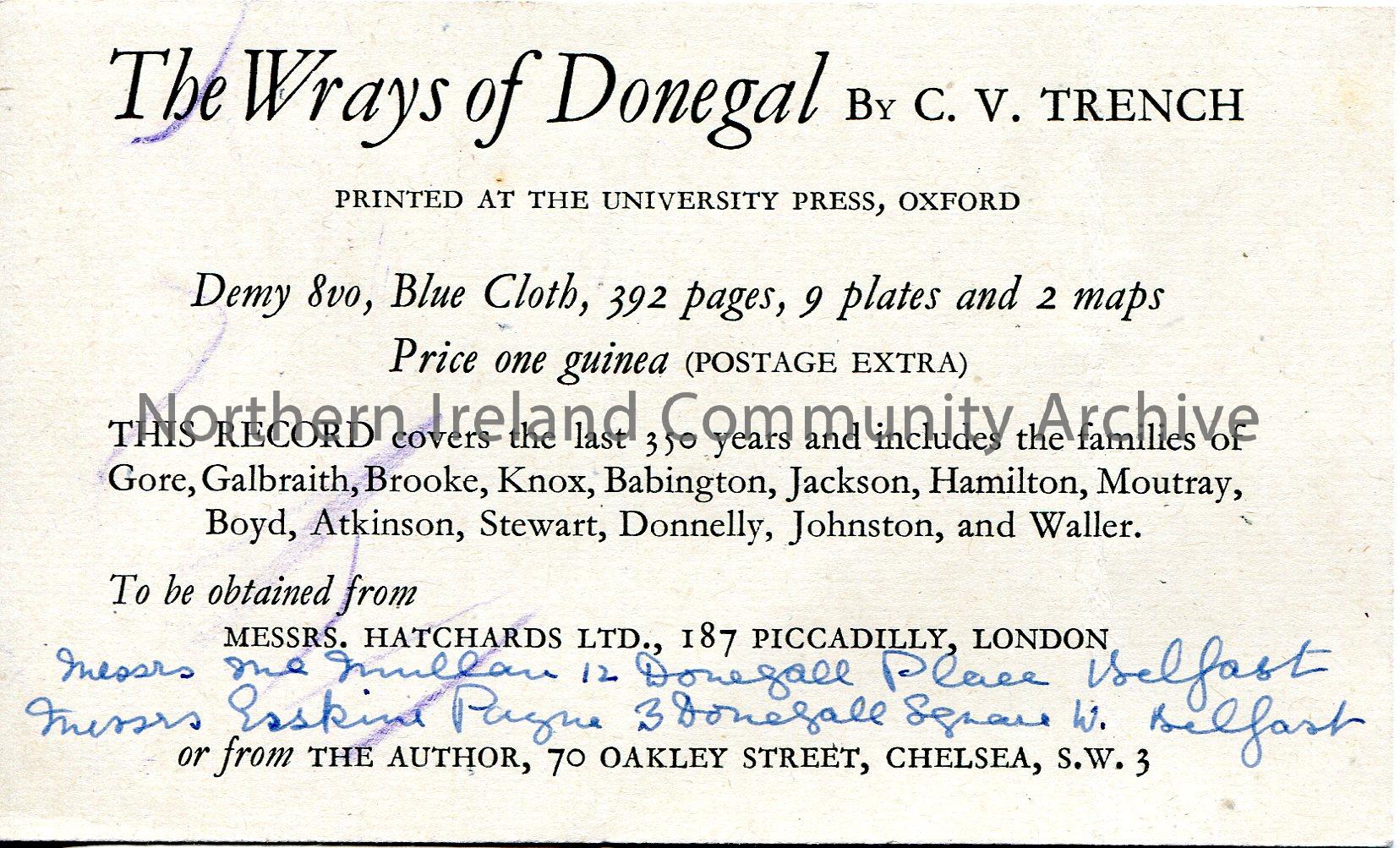 Printed information on reverse of a blank postcard re the publication of a book 'The Wrays of Donegal' by Charlotte Violet Trench in 1945. The book is available in London and Belfast or from the author herself. Handwritten names and address of locations in Belfast.
