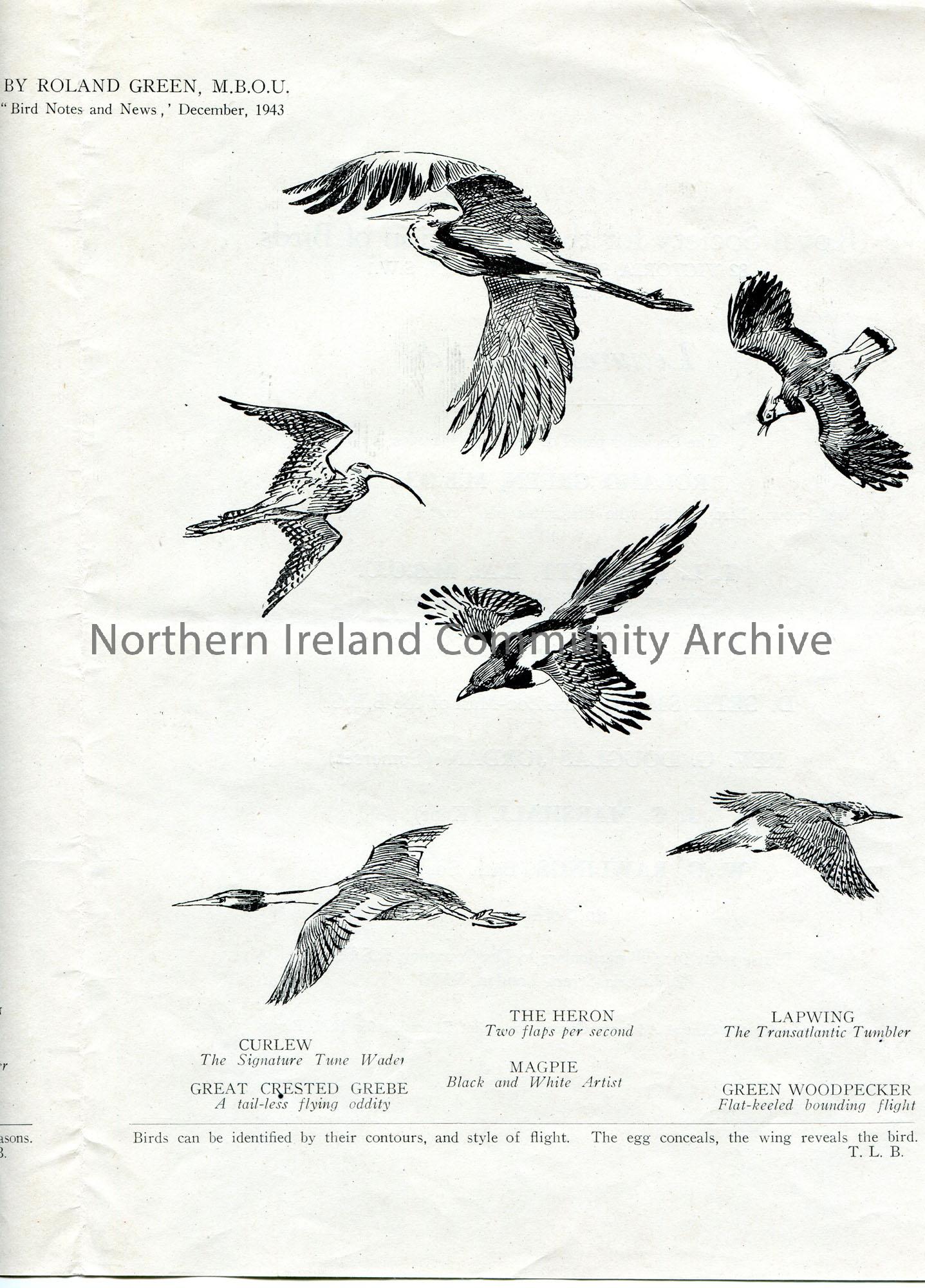Printed leaflet of the Royal Society For The Protection of Birds. A foreword by T. Bartlett, B.A., M.B.O.U re 'Lectures on Bird Life'. Printed sketches of birds by Roland Green, M.B.O.U. Reprinted from 'Bird Notes and News.' December, 1943.