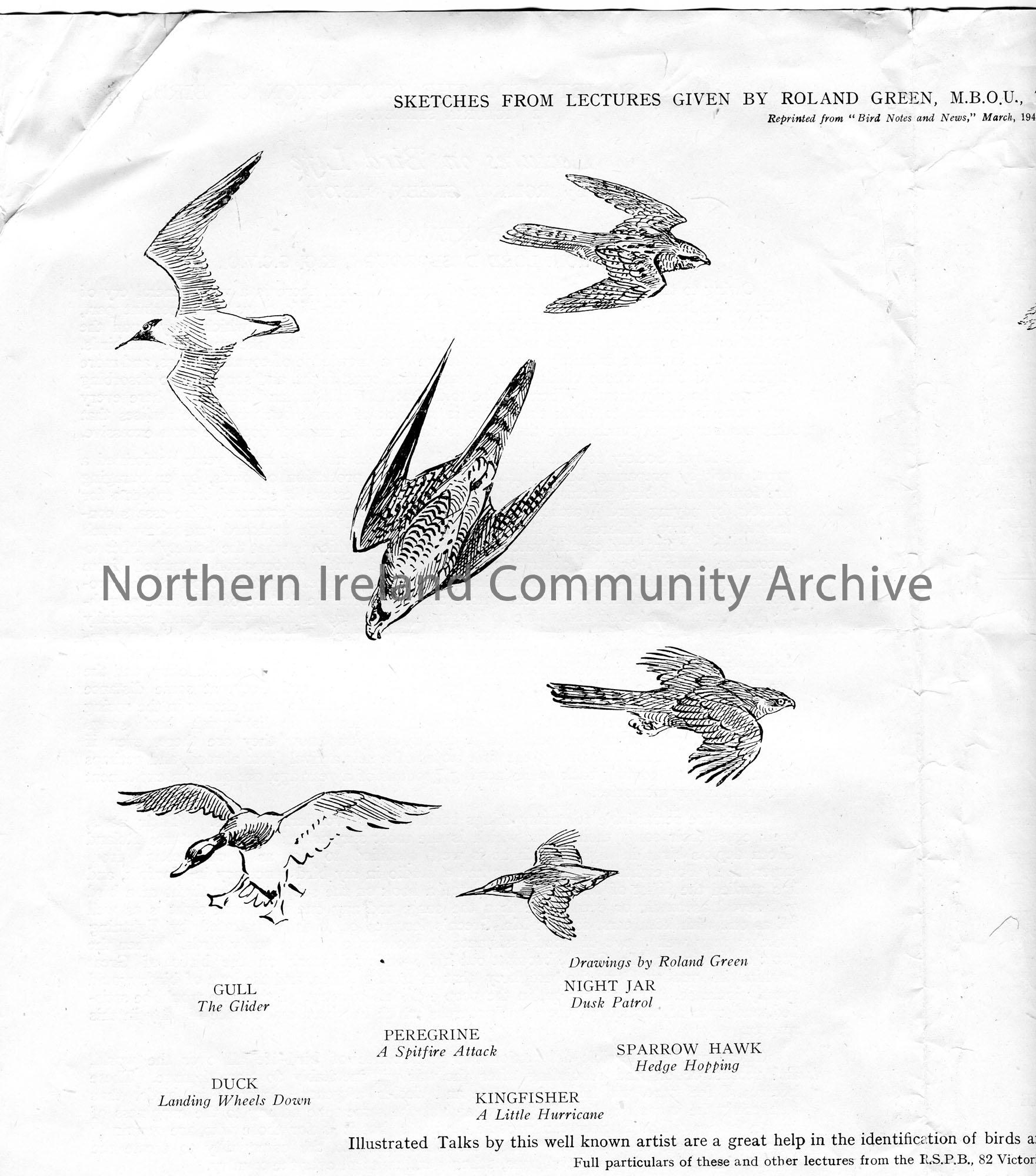 Printed leaflet of the Royal Society For The Protection of Birds. A foreword by The Rt. Hon. Lord Desborough, K.G. G.C.V.O., D.C.L re 'Lectures on Bird Life' by Roland Green, M.B.O.U. Printed sketches of birds which were used in the lectures to members of the Serving Forces. Reprinted from 'Bird Notes and News,' March, 1943.