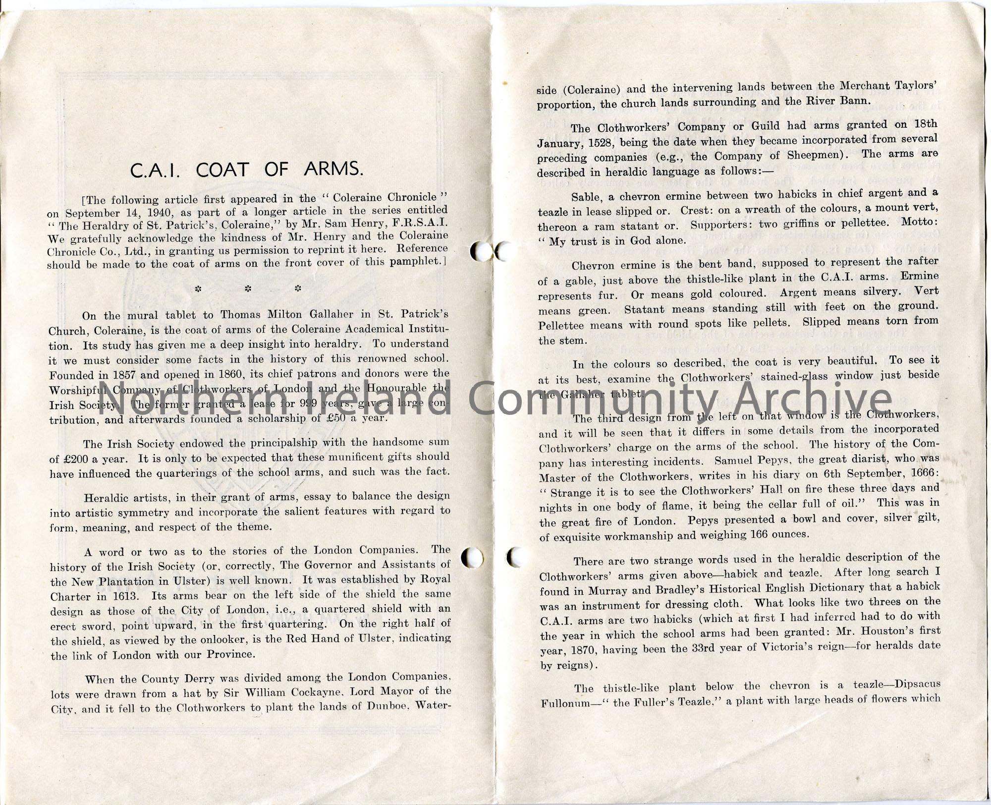 Printed leaflet re Coleraine Academical Institution Coat of Arms by Sam Henry. This is an article which first appeared in the Coleraine Chronicle newspaper on 14th September 1940 as part of a series called, 'The Heraldry of St. Patrick's, Coleraine'.