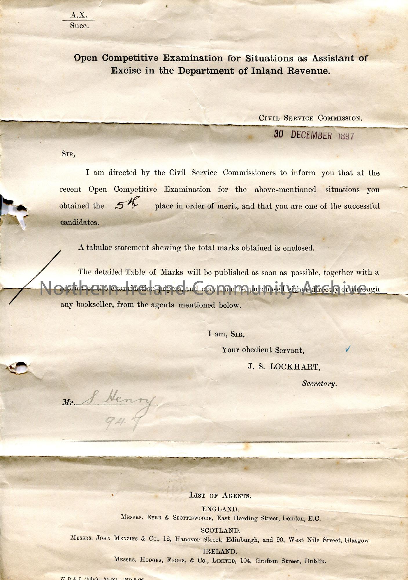 Printed letter to Sam Henry from J. S. Lockhart. Informing Sam that he was successful in his Open Competitive Examination for Situations as Assistant of Excise in the Department of Inland Revenue.
