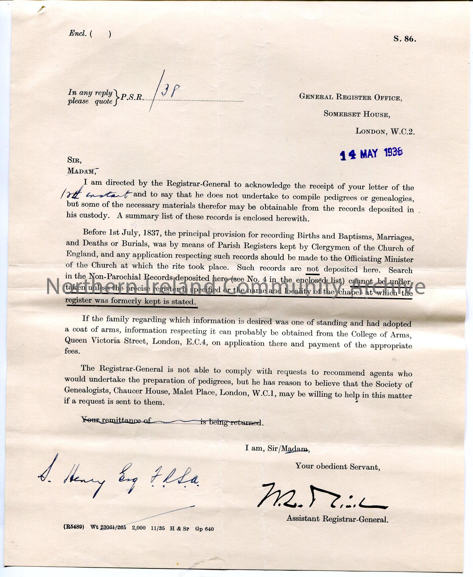 Printed letter to Sam Henry in reply to his letter. Informs Sam that the Registrar-General cannot carry out research re pedigrees or genealogies. Gives Sam references to to records where the information he is looking for may be found.