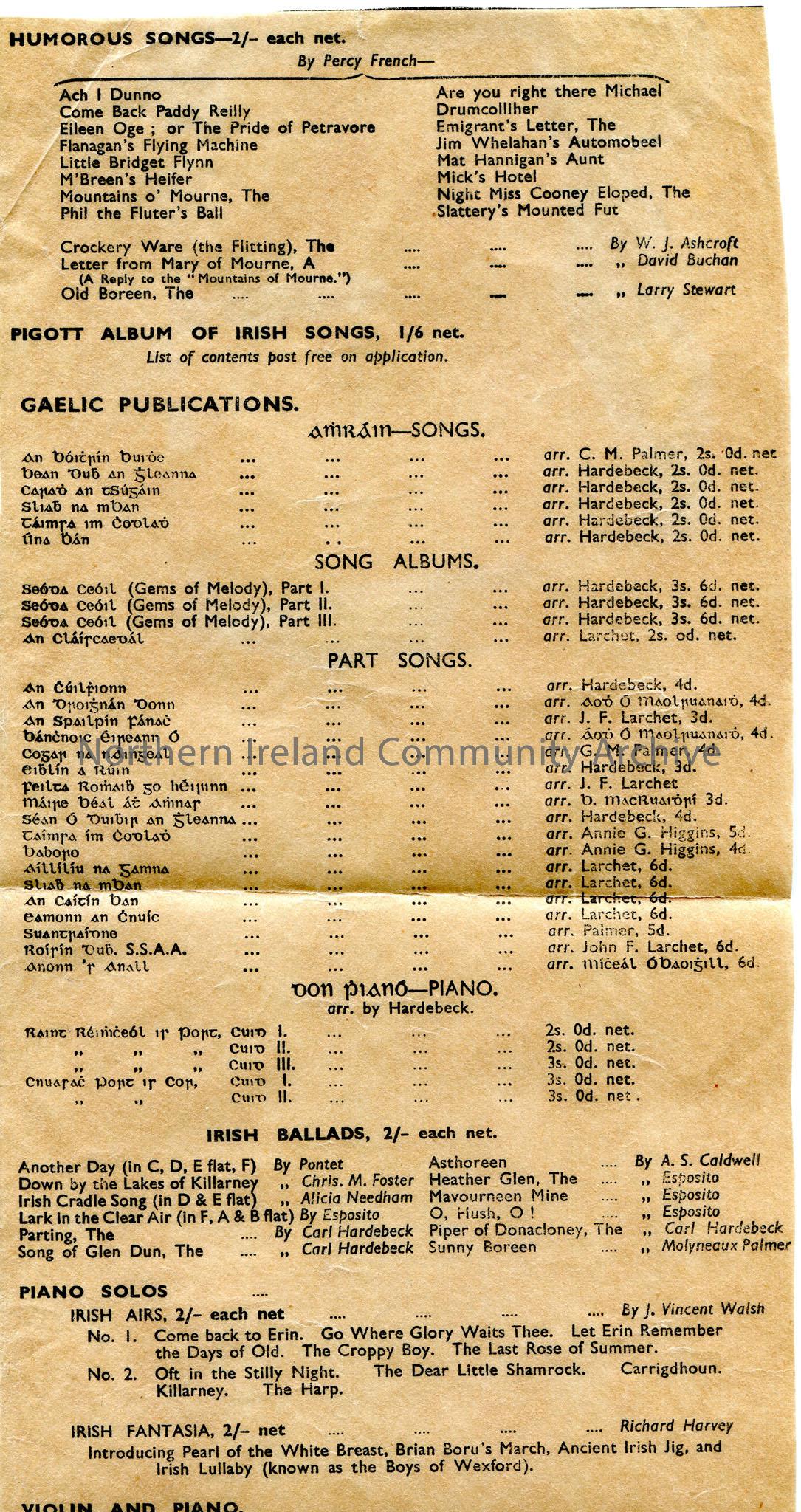 Printed list of humorous songs by Percy French, also lists Gaelic Publications, Irish Ballads and Piano Solos on brown paper from Pigott & Co., Ltd., …
