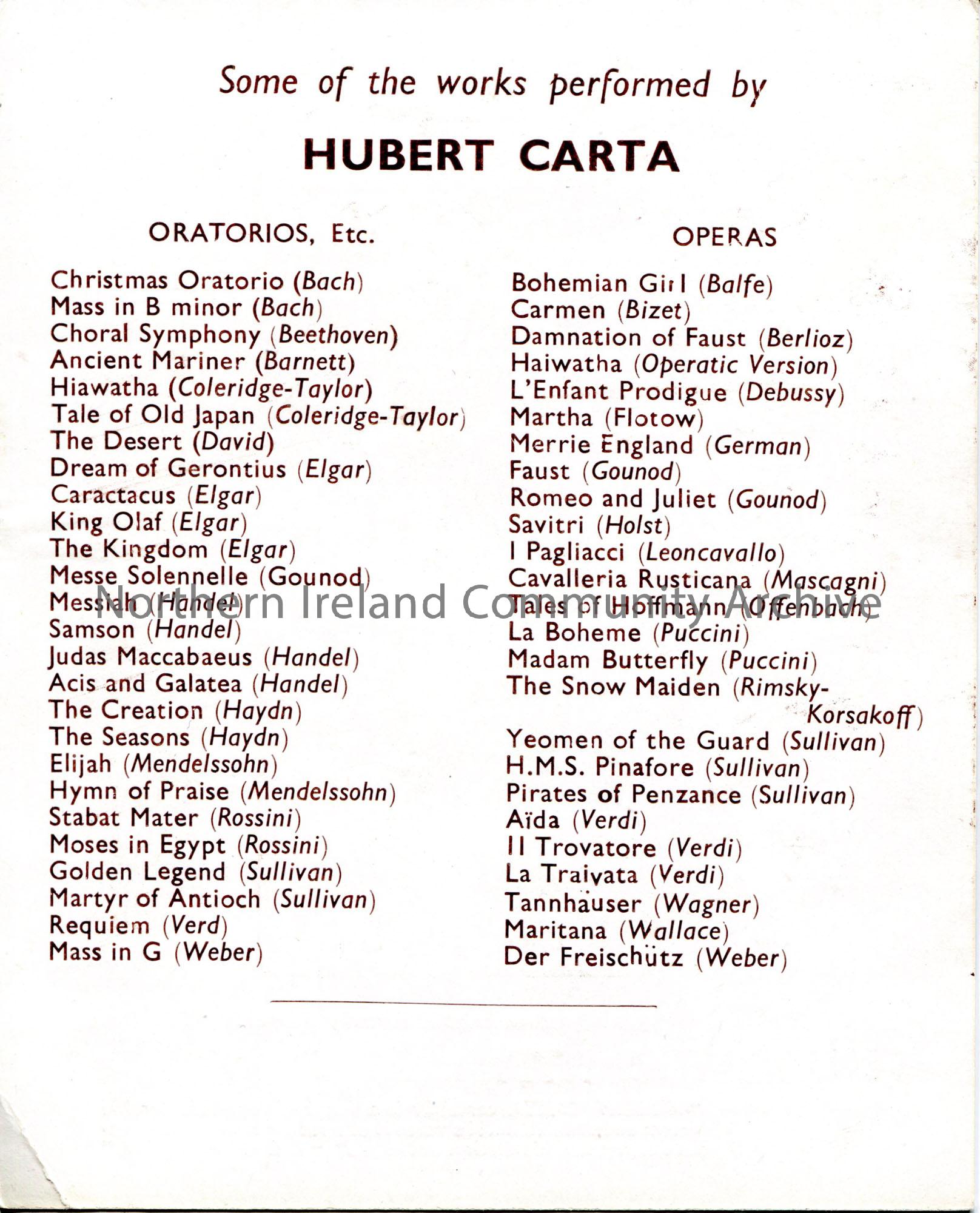 Printed list of works performed by tenor, Hubert Carta. On one side is a portrait sketch of him. – scan112b