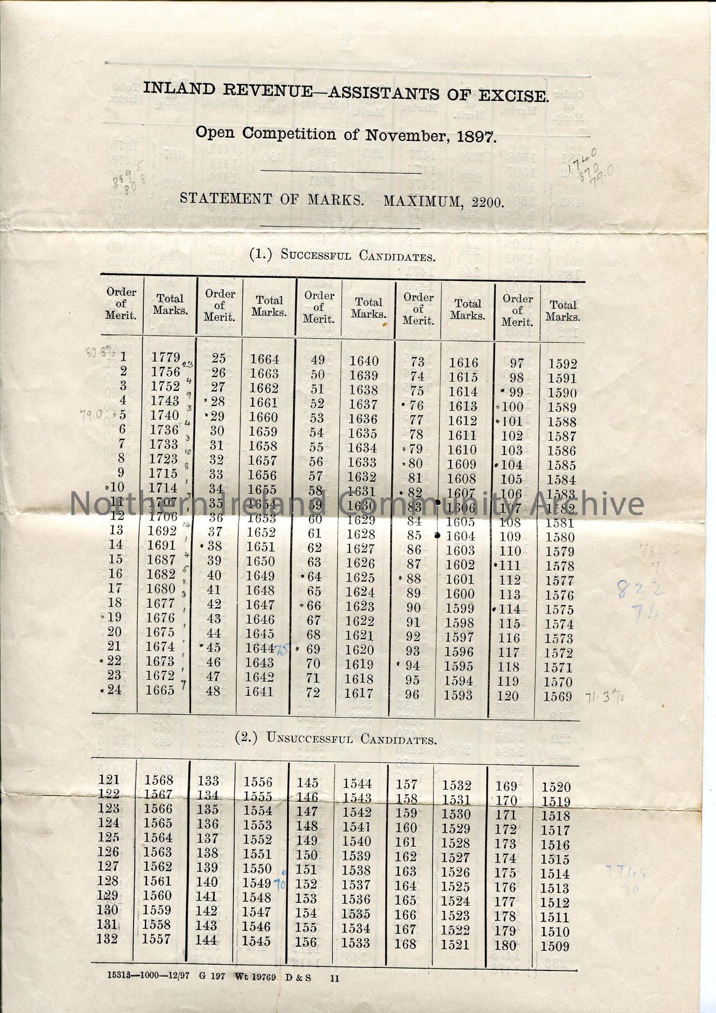 Printed lists of successful and unsuccessful candidates for 'Inland Revenue - Assistants of Excise. Open Competition of November, 1897. Statement of Marks'. From the Civil Service Commission, 28th December, 1897. Annotated with numbers in pencil on front cover.