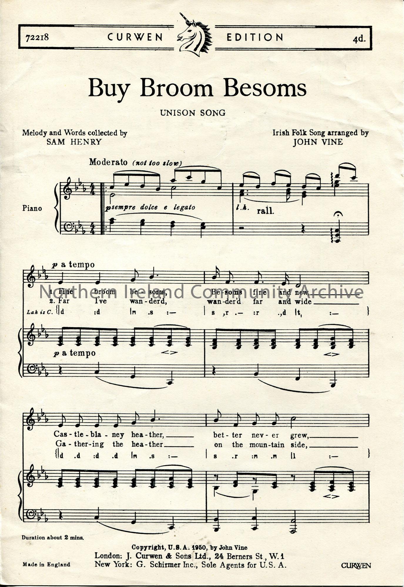 Printed music manuscript of an Irish Folk Song arranged by John Vine. Melody and Words collected by Sam Henry. Song titled, 'Buy Broom Besoms'. Curwen Edition. Copyright U.S.A, 1950 by John Vine.