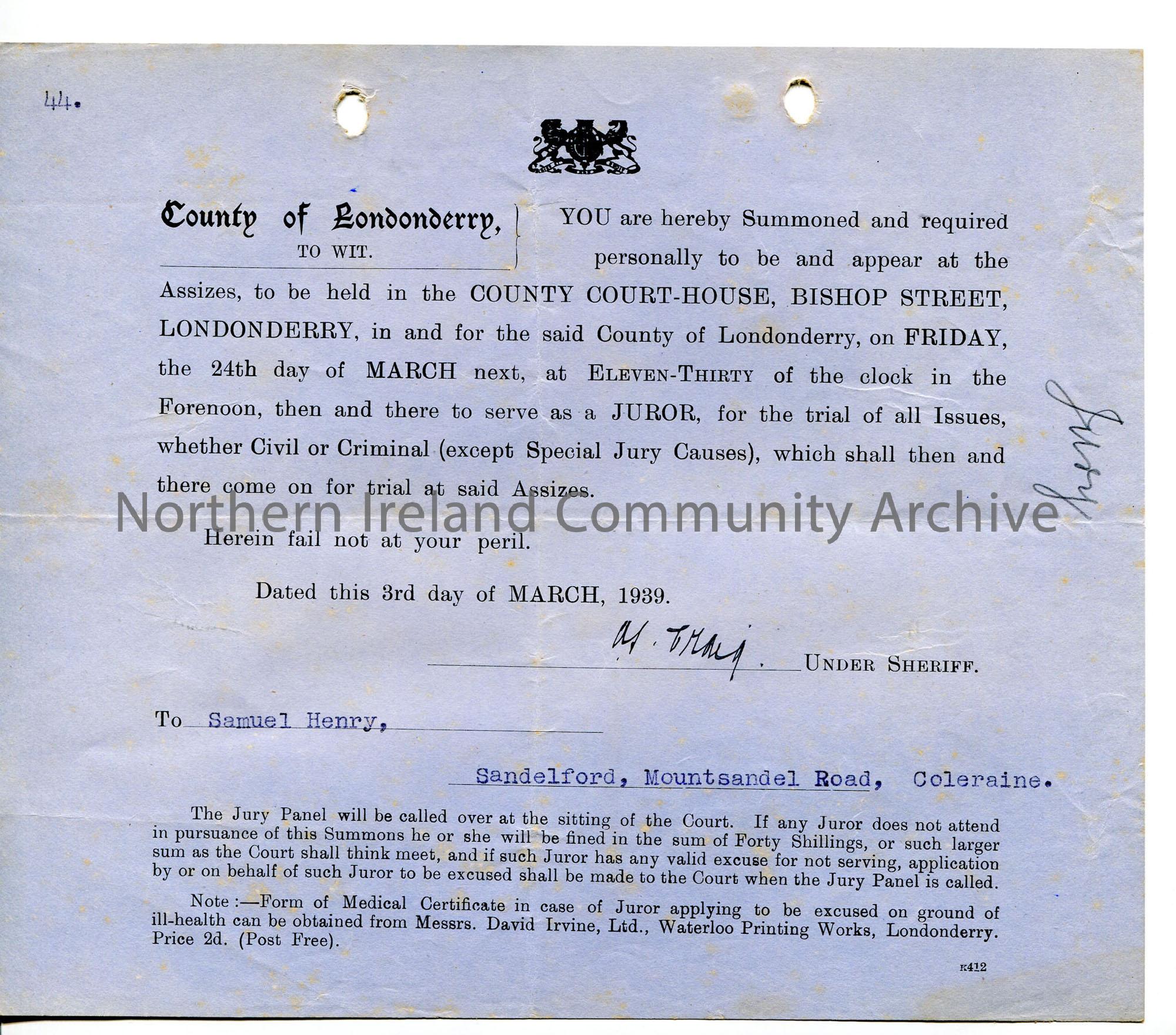 Printed notice for Sam Henry to appear as juror at County Court House, Bishop Street, Londonderry