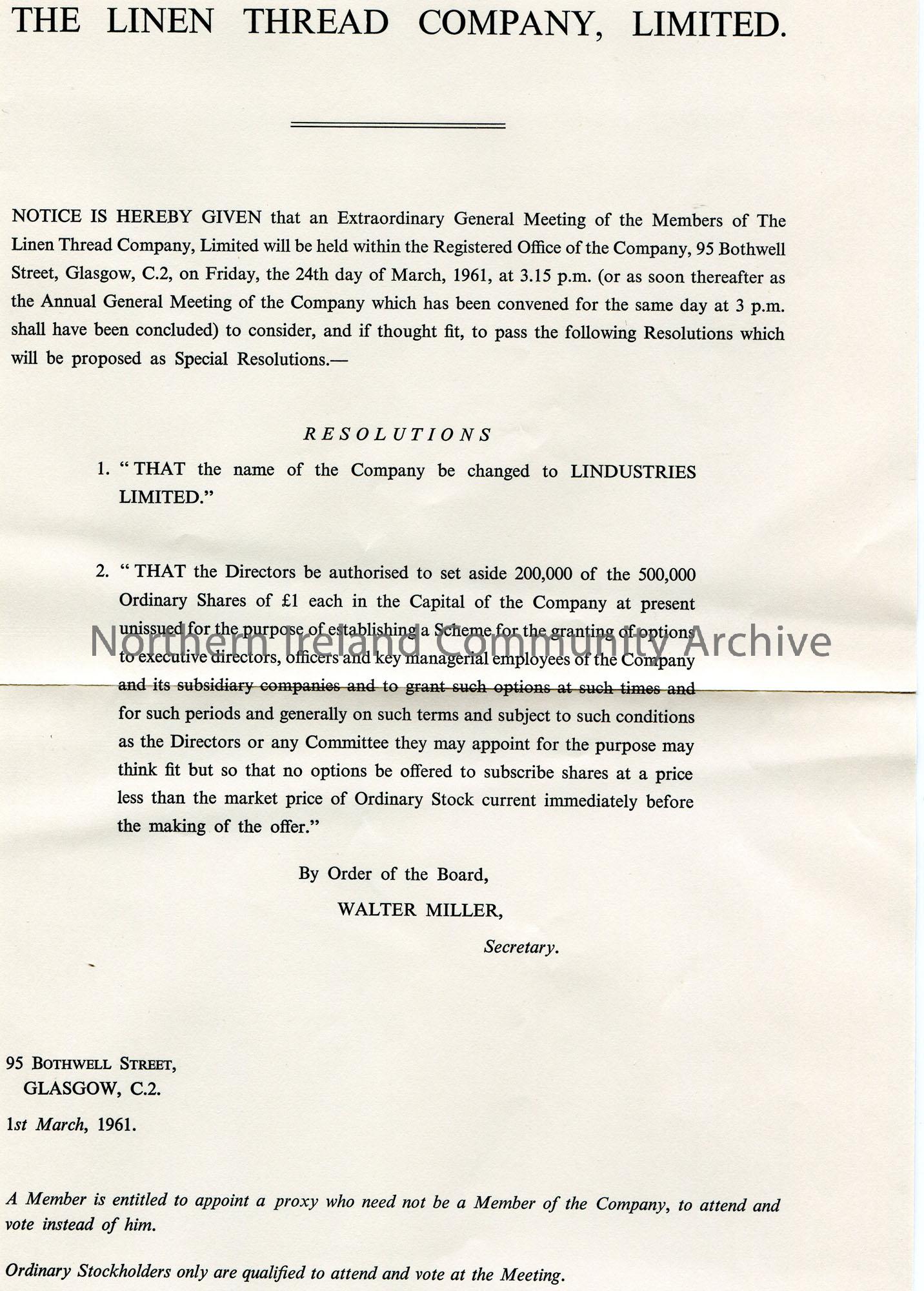 Printed notice of an Extraordinary General Meeting of the Members of The Linen Thread Company, Limited. Scheduled for 24th March, 1961. Lists Resoluti…