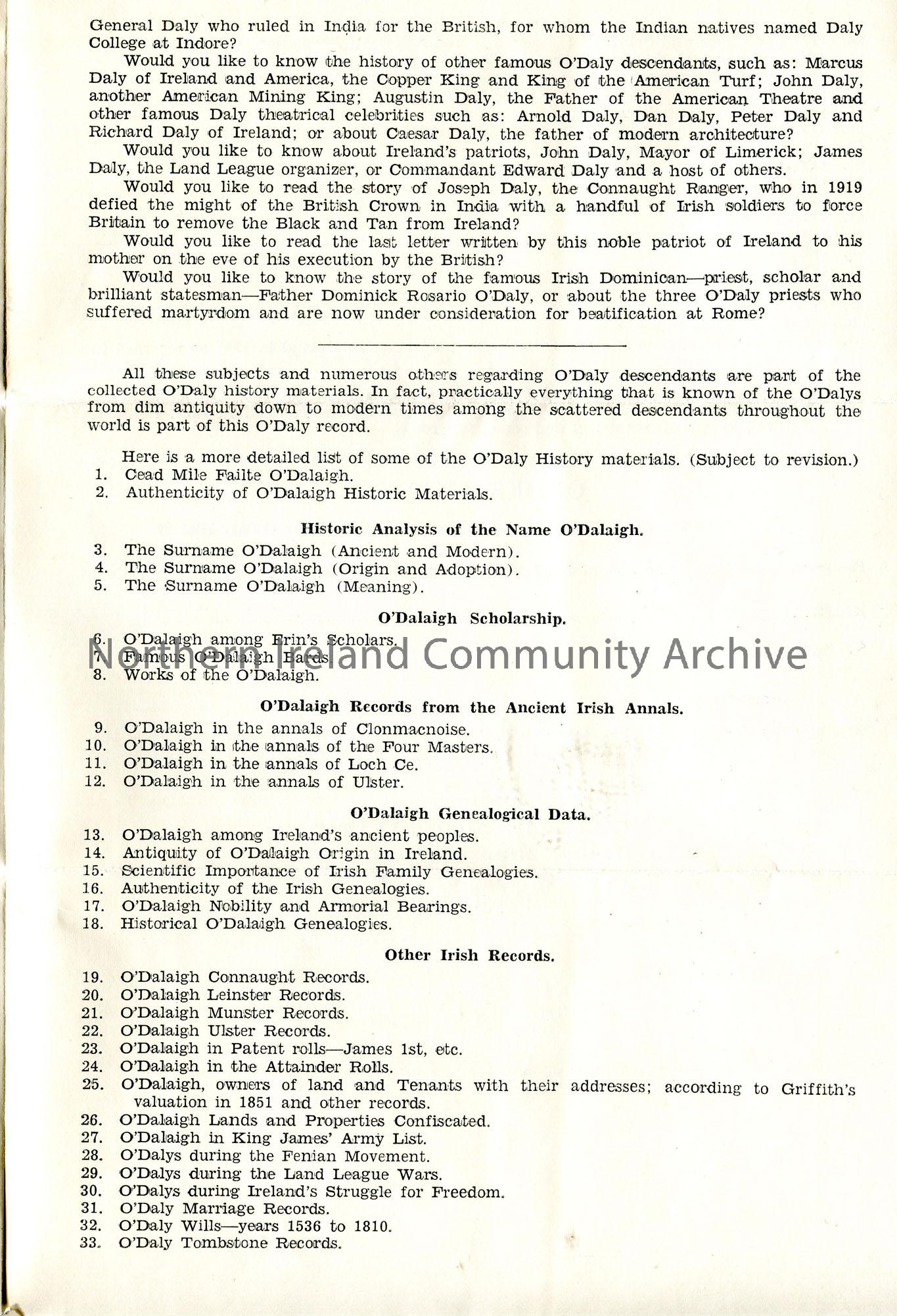 Printed one page folded leaflet of a summary of the book “History of the O’Daly’s” The Ancient Irish Sept of Corca Adaimh. By Edmund Emmet O’Daly. O’D… – scan013c