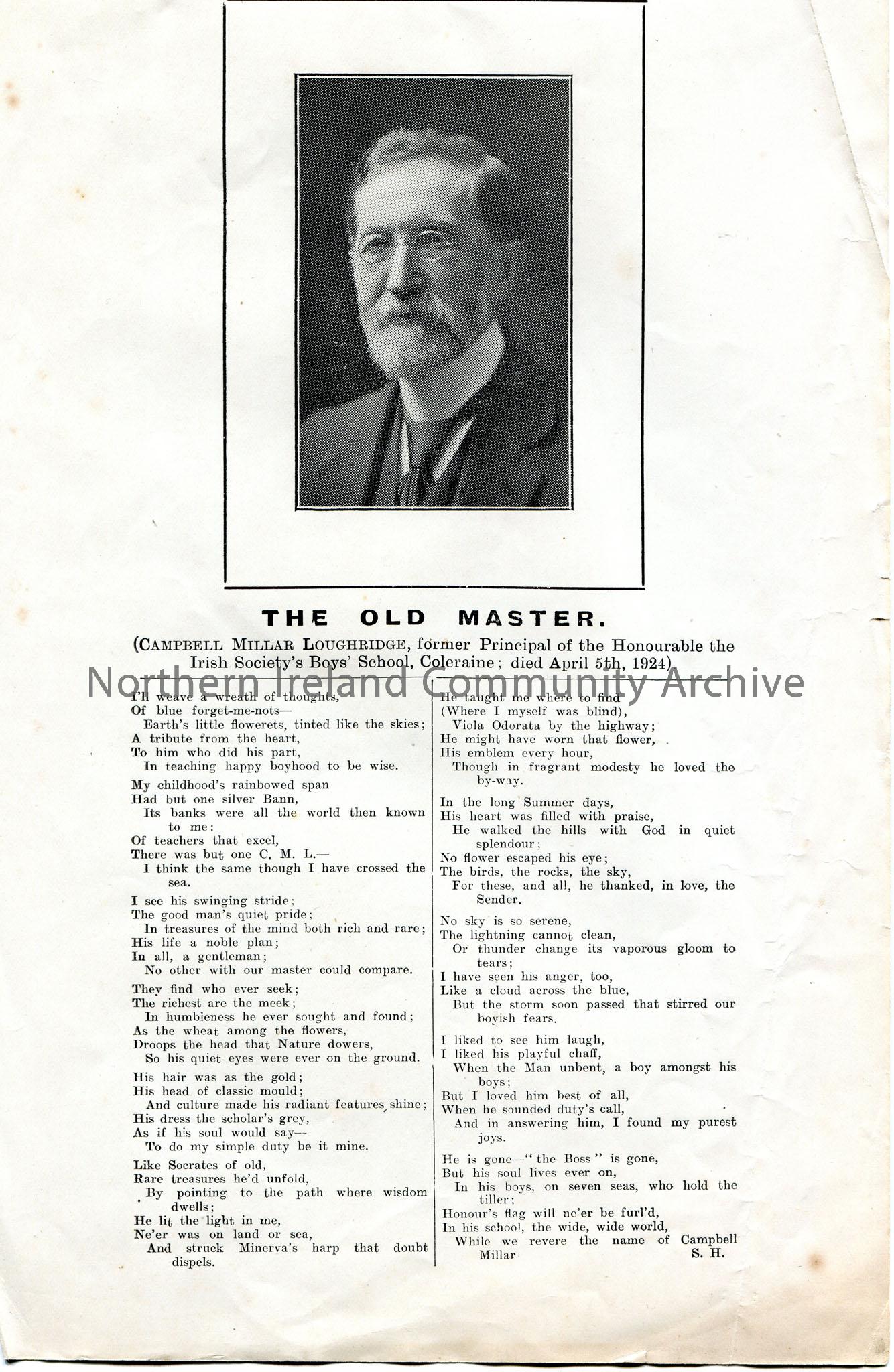 Printed poem by Sam Henry re Campbell Millar Loughridge, former Principle of the Honourable the Irish Society's Boys' School, Coleraine. Titled. 'The Old Master'. Includes photographic image of the former Principle.