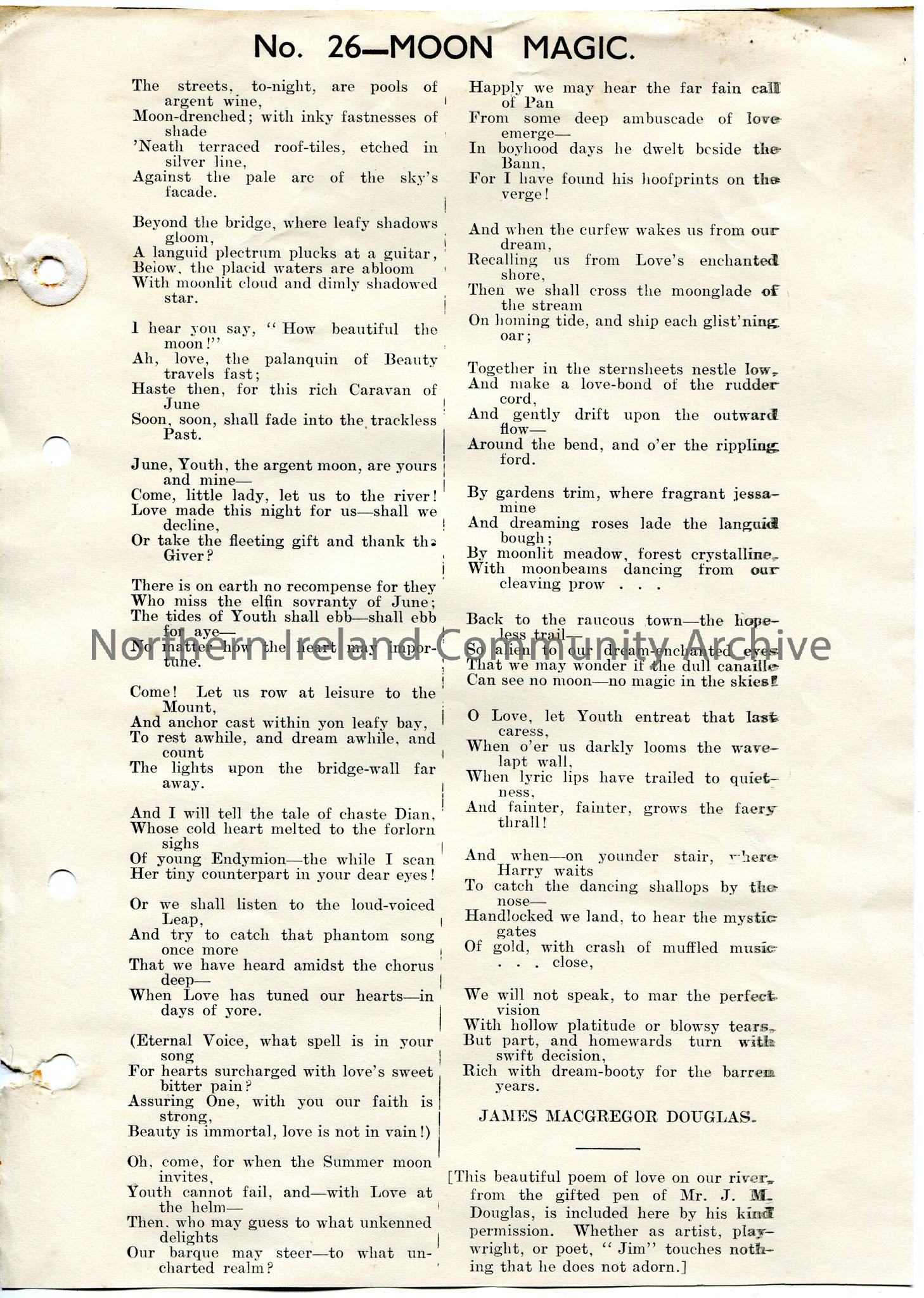 Printed poem titled, ‘Moon Magic’. Possibly appeared in the ‘Chronicle’ newspaper. By James MacGregor Douglas.