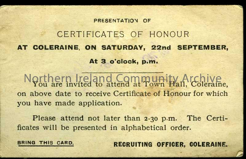 Printed postcard invitation to attend presentation of Certificates of Honour applied for, in Coleraine Town Hall