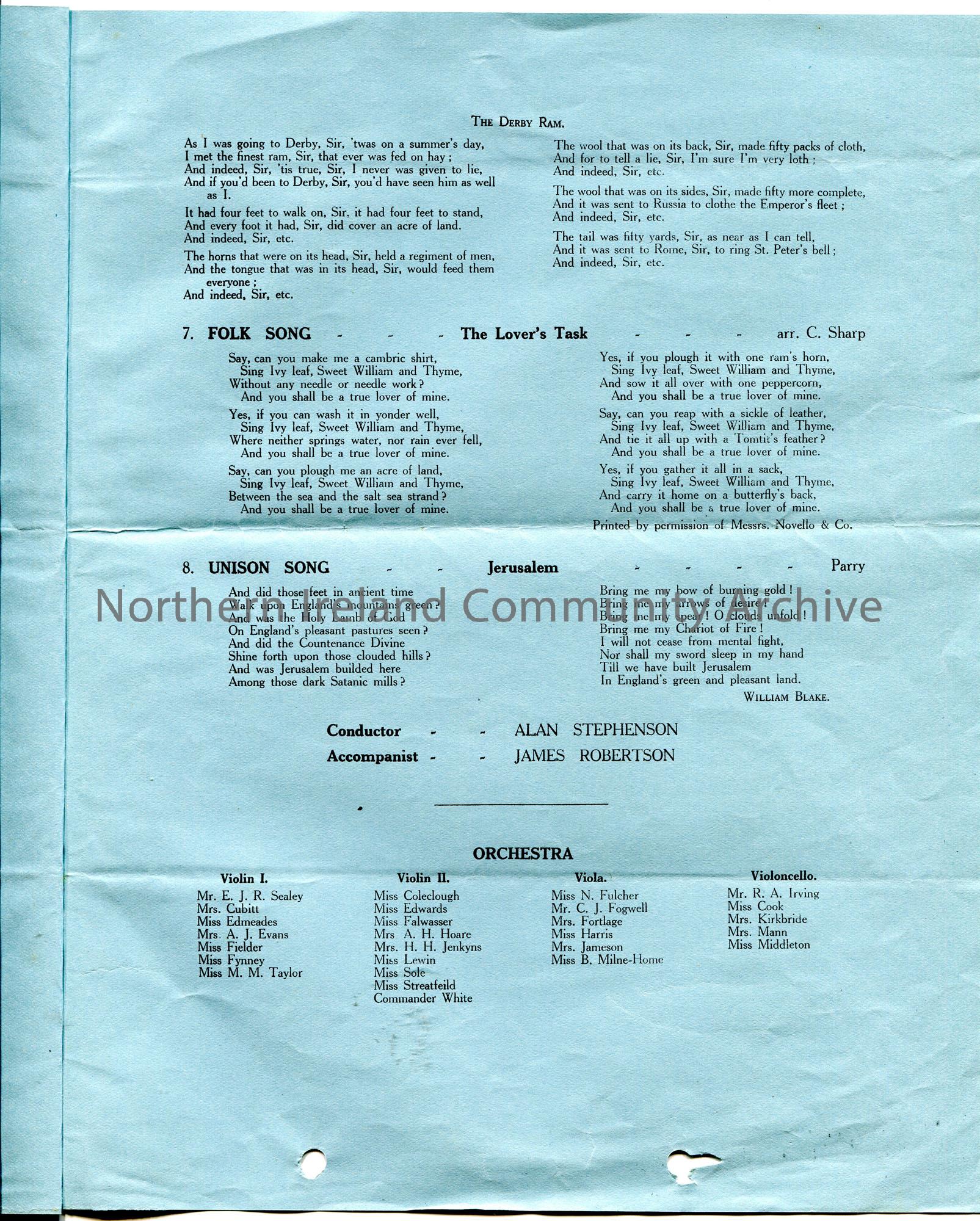 Printed Programme of Concert on blue paper of 'The Sixteenth Winchester County Music Festival, The Guildhall, Winchester'. Dated Sunday 13th March, 1937. Sam Henry is mentioned in the programme as having given permission for the use of 'The Fairy Song'. Arranged by John Vine whom Sam corresponded with re arrangements of other songs as well as this one. An 'X' is marked in the programme where Sam is mentioned.