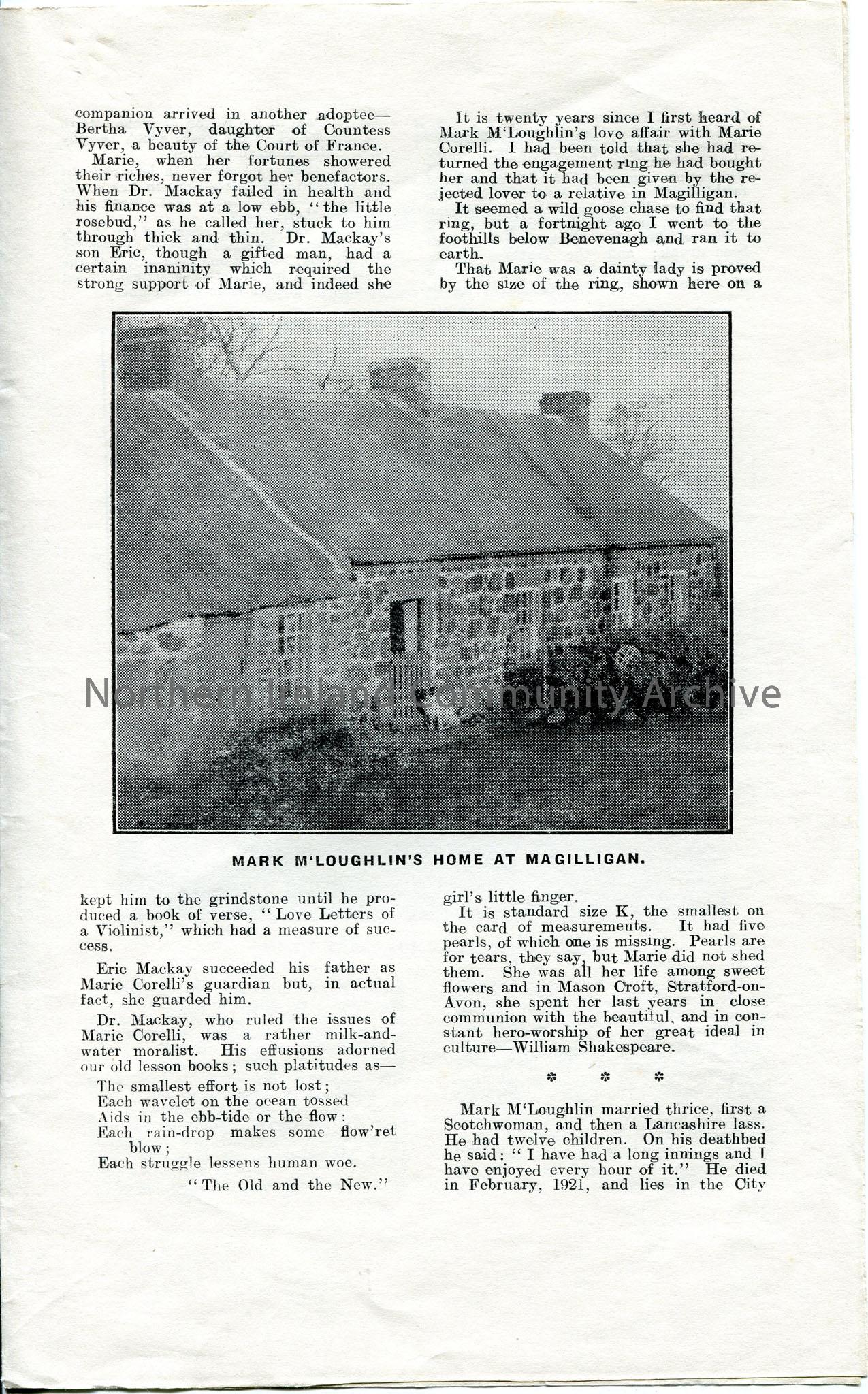 Printed single fold leaflet entitled ' A Magilligan Man's Romance - Marie Corelli's Only Lover' by Sam Henry. The story of the love affair between Mark McLoughlin, an Customs and Excise man born in the Magilligan area, and author Marie Corelli, whom he met while serving in the Highlands of Scotland. Photographs include one of engagement ring and of McLoughlin's family home - the 'haunted house' of Magilligan