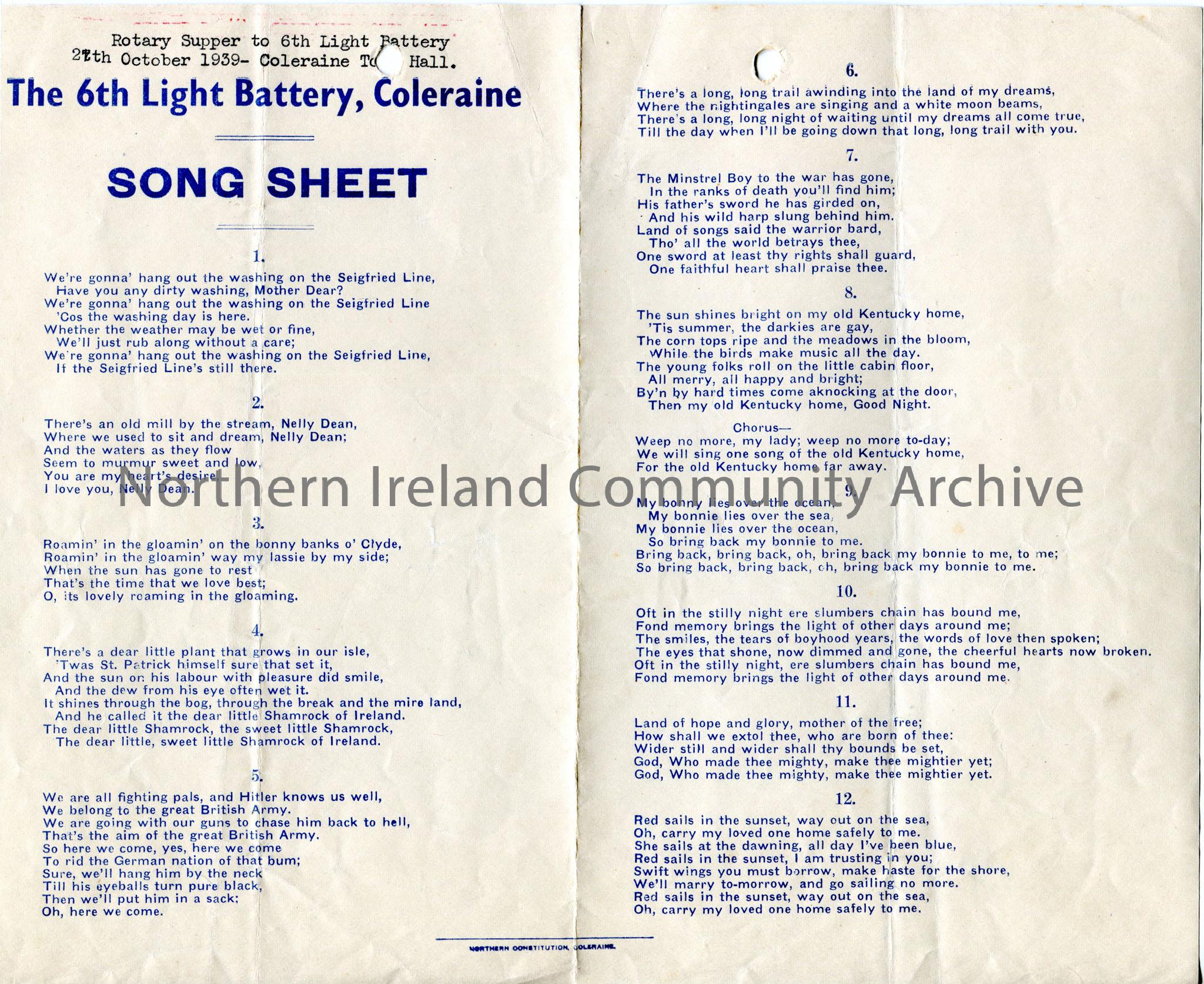 Printed song sheet of twelve verses from wartime and patriotic songs. Rotary Supper to 6th Light Battery on 27th October, 1939 at Coleraine Town Hall. 'Northern Constitution, Coleraine' printed at bottom of page.