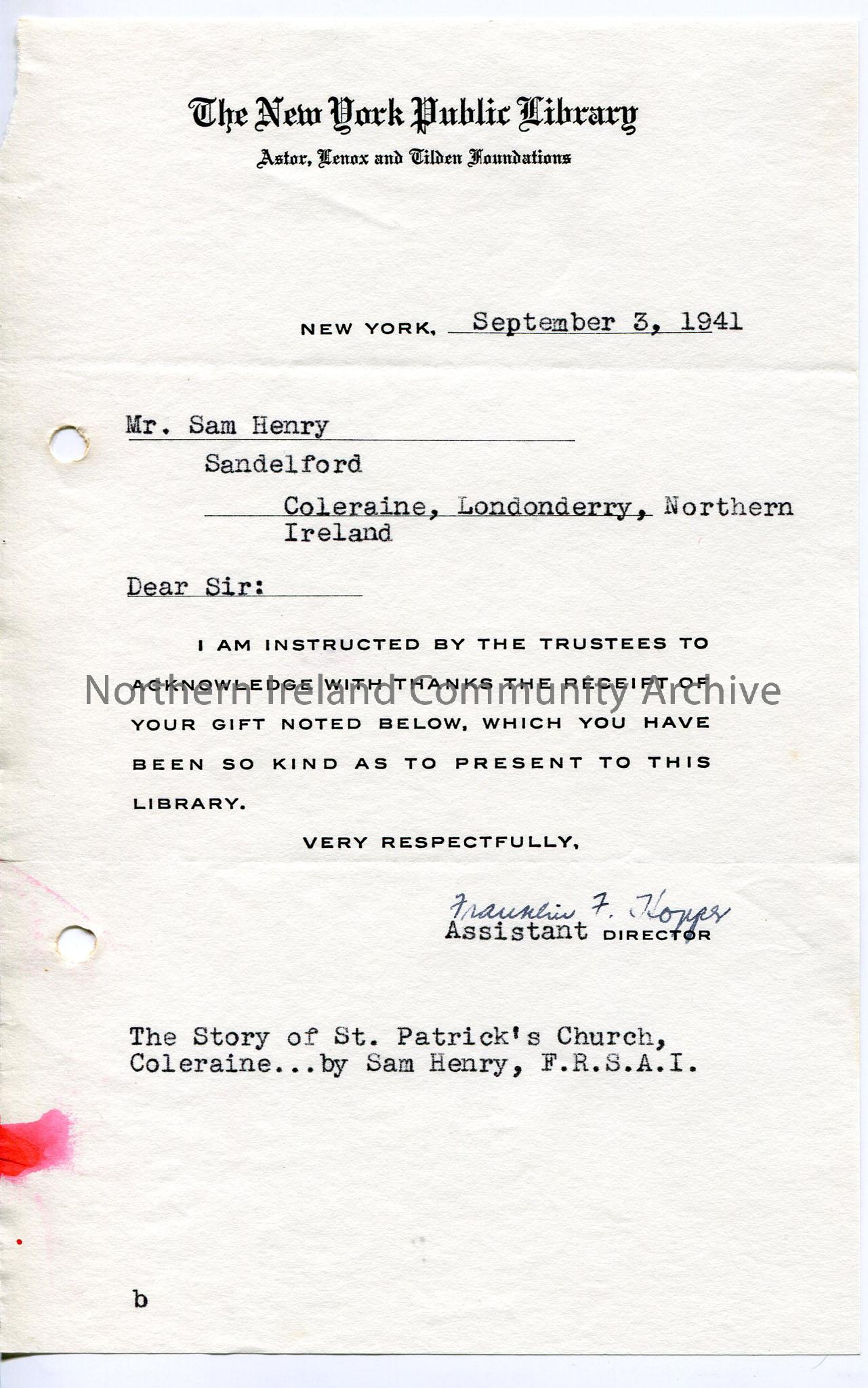 Printed standard letter with typed inserts – from New York Public Library thanking Sam for copy of ‘Story of St Patrick’s Church’