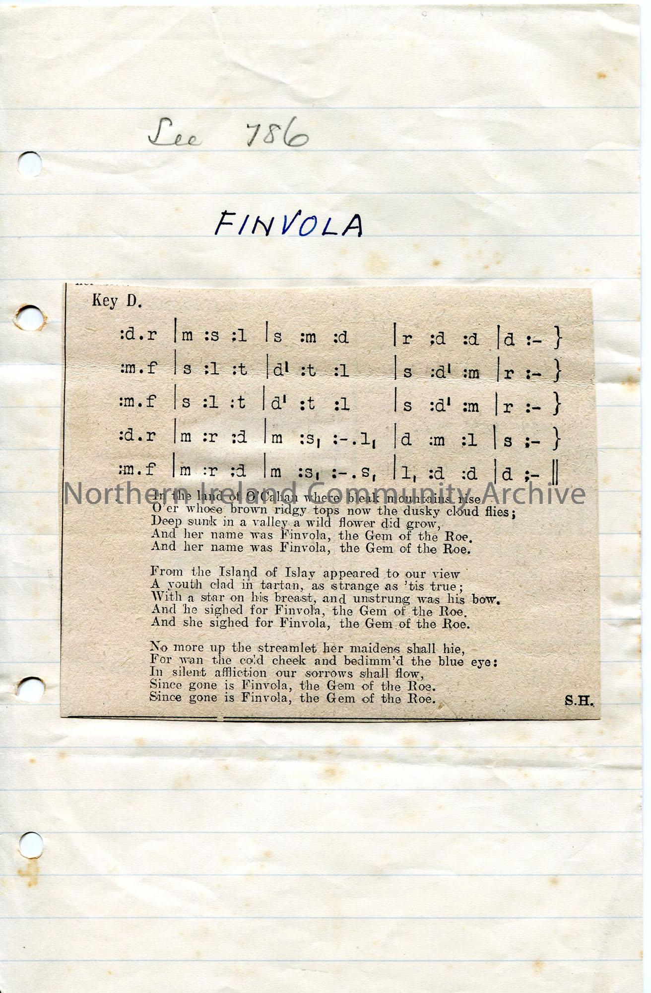 Printed tonic sol-fa notation and words to 'Finvola (also known as Finvola the gem of the Roe) - affixed to page. Uses local dialect. Love song about Islay youth and Roe Valley girl