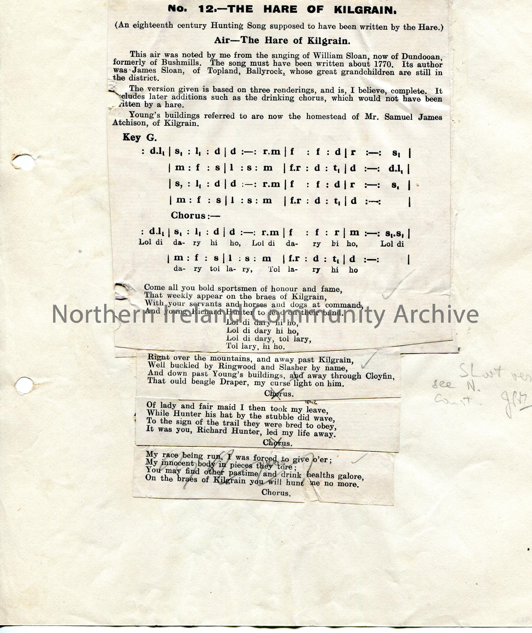 Printed tonic sol-fa notation and words to song cut out and stuck to the back of Sam Henry's personal letter headed paper. Titled, 'No. 12 - The Hare of Kilgrain'. It is an 18th Century Hunting Song. Refers to song origin. 'Short version see N ?, J.M' written in pencil beside song.