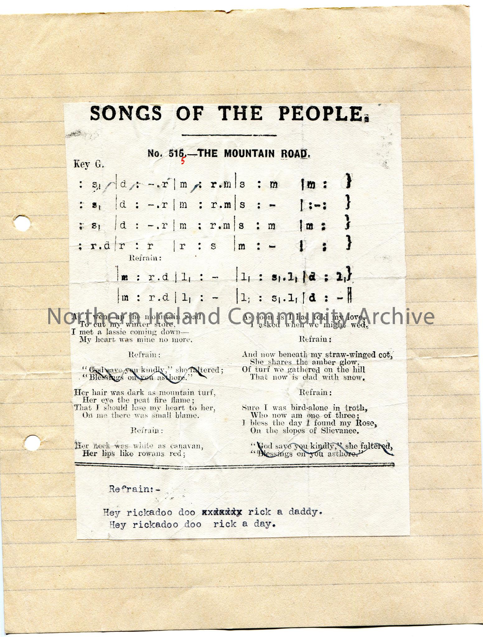 Printed tonic sol-fa notation and words to song titled, 'No. 515 - The Mountain Road'. Page is titled, 'Songs of the People'. (Page cut out and stuck to lined paper). Two verses are scored out and their replacement is typed at the bottom of the page.