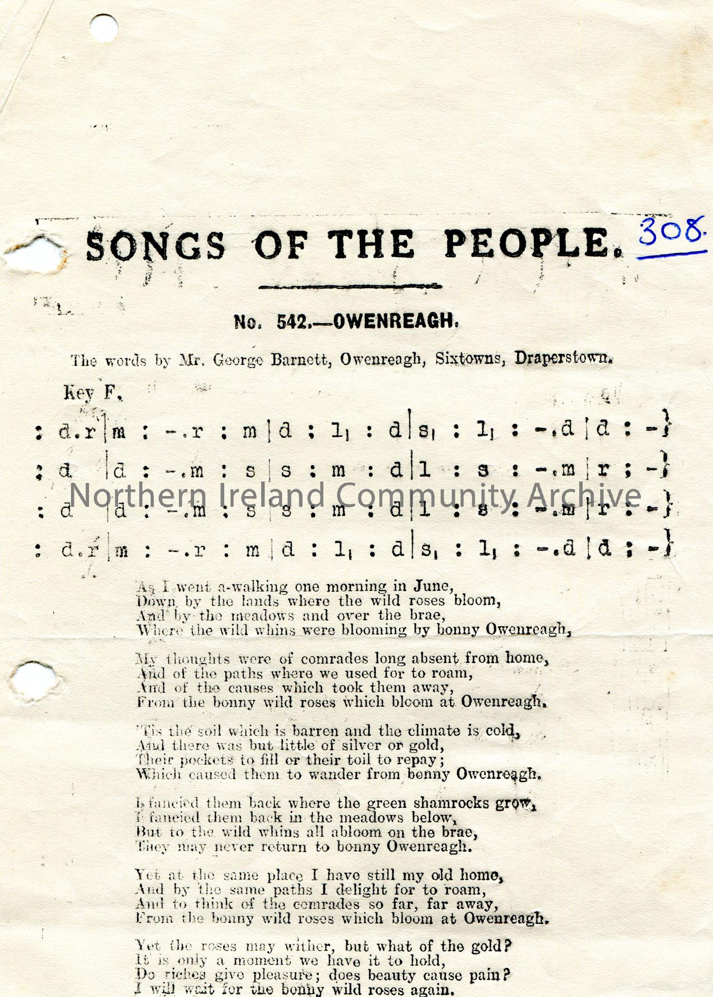 Printed tonic sol-fa notation and words to song titled, 'No 542 - Owenreagh.' Part of 'Songs of the People'. Number '308' written in Biro in top right corner. Words by Mr George Barnett, Owenreagh, Sixtowns, Draperstown.