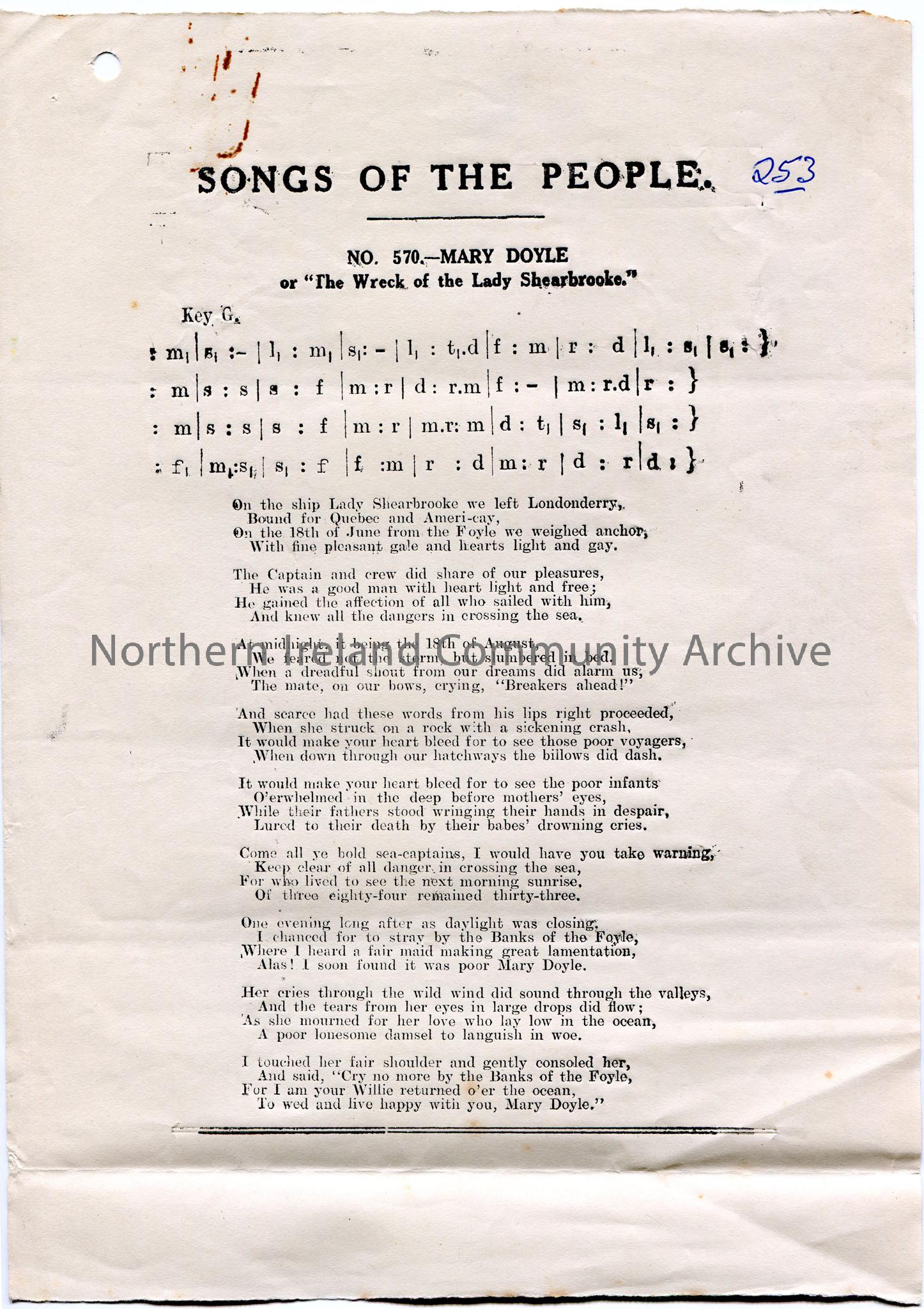 Printed tonic sol-fa notation and words to song titled, 'No 570 - Mary Doyle or The Wreck of the Lady Shearbrooke'. Part of 'Songs of the People'. Number '253' written in Biro top corner of page.