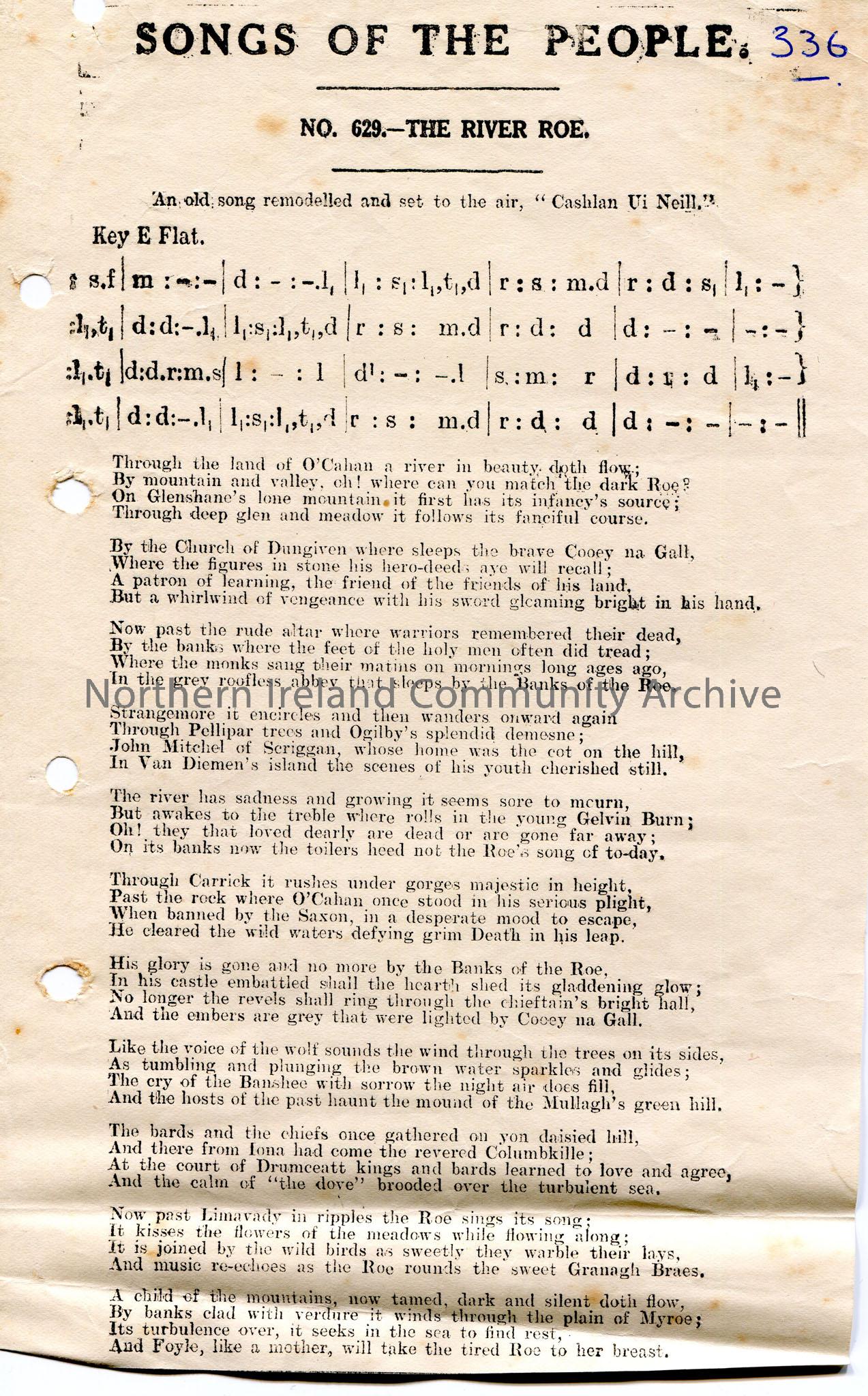 Printed tonic sol-fa notation and words to song titled, 'No 629 - The River Roe' as part of 'Songs of the People'. Number '336' written in Biro in top right corner. 'An old song remodelled and set to the air, "Cashlan Ui Neill."' Mentions O'Cahan and Limavady.