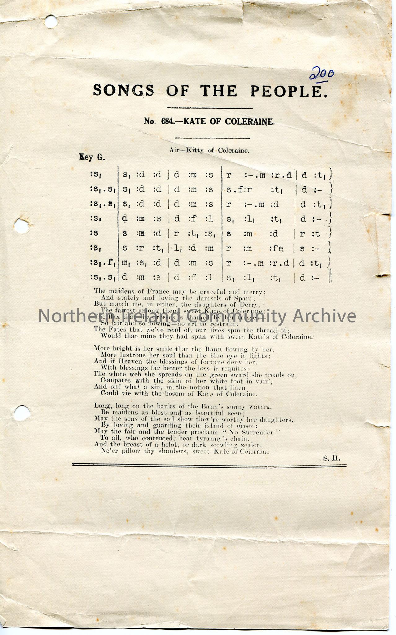 Printed tonic sol-fa notation and words to song titled, ‘No 684 – Kate of Coleraine’ as part of ‘Songs of the People’. Number ‘200’ written in Biro in…