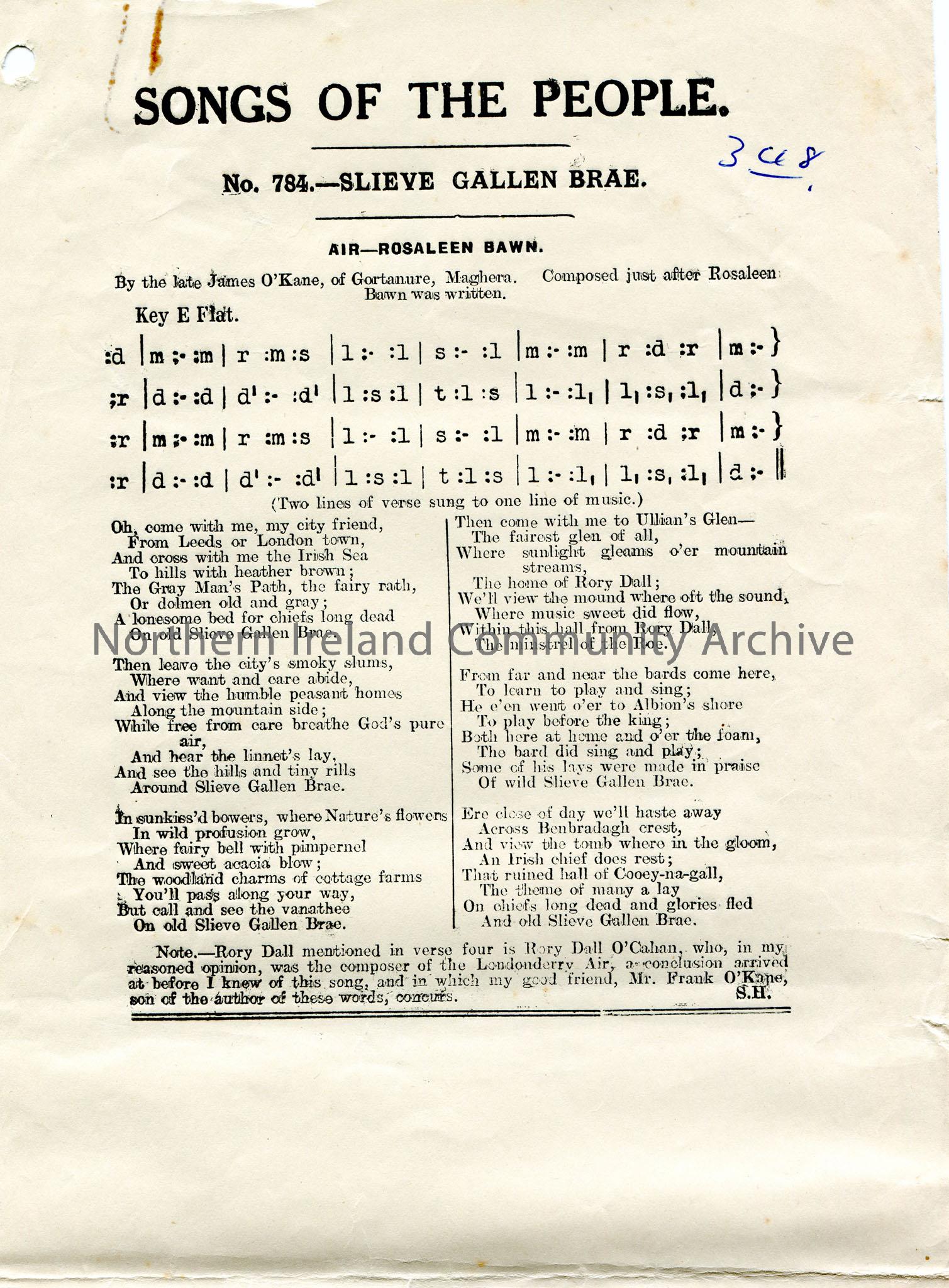 Printed tonic sol-fa notation and words to song titled, 'No 784 - Slieve Gallen Brae'. Part of 'Songs of the People'. Number '348' written in Biro top corner of page. By James O'Kane, Gortanure, Maghera. Mentions the harpist Rory Dall O'Cahan.