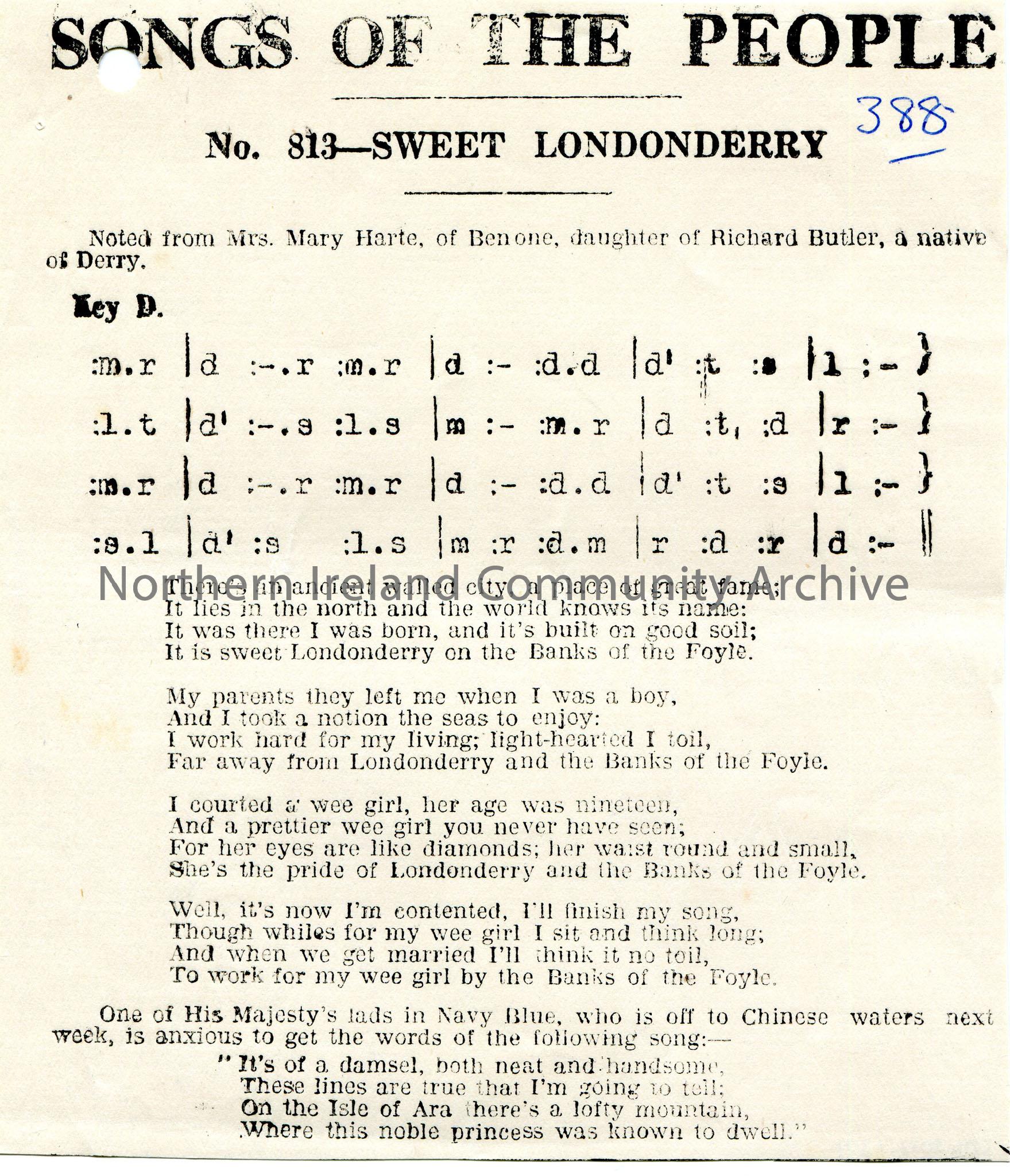 Printed tonic sol-fa notation and words to song titled, 'No 813 - Sweet Londonderry'. Part of 'Songs of the People'. Number '388' written in Biro top of page. Noted from Mrs Mary Harte, Benone.