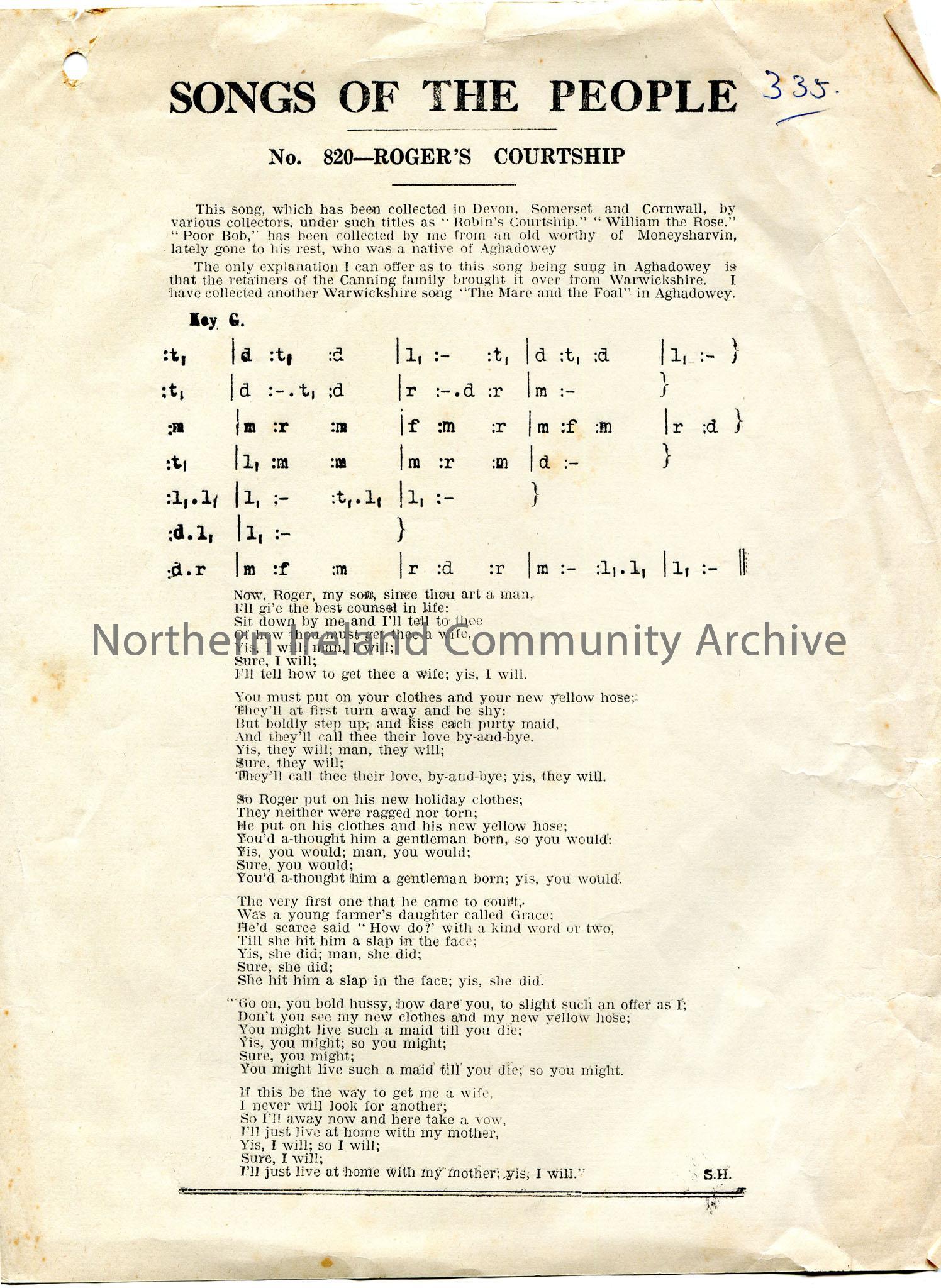 Printed tonic sol-fa notation and words to song titled, ‘No 820 – Roger’s Courtship.’ Part of ‘Songs of the People’. Number ‘335’ written top corner o…
