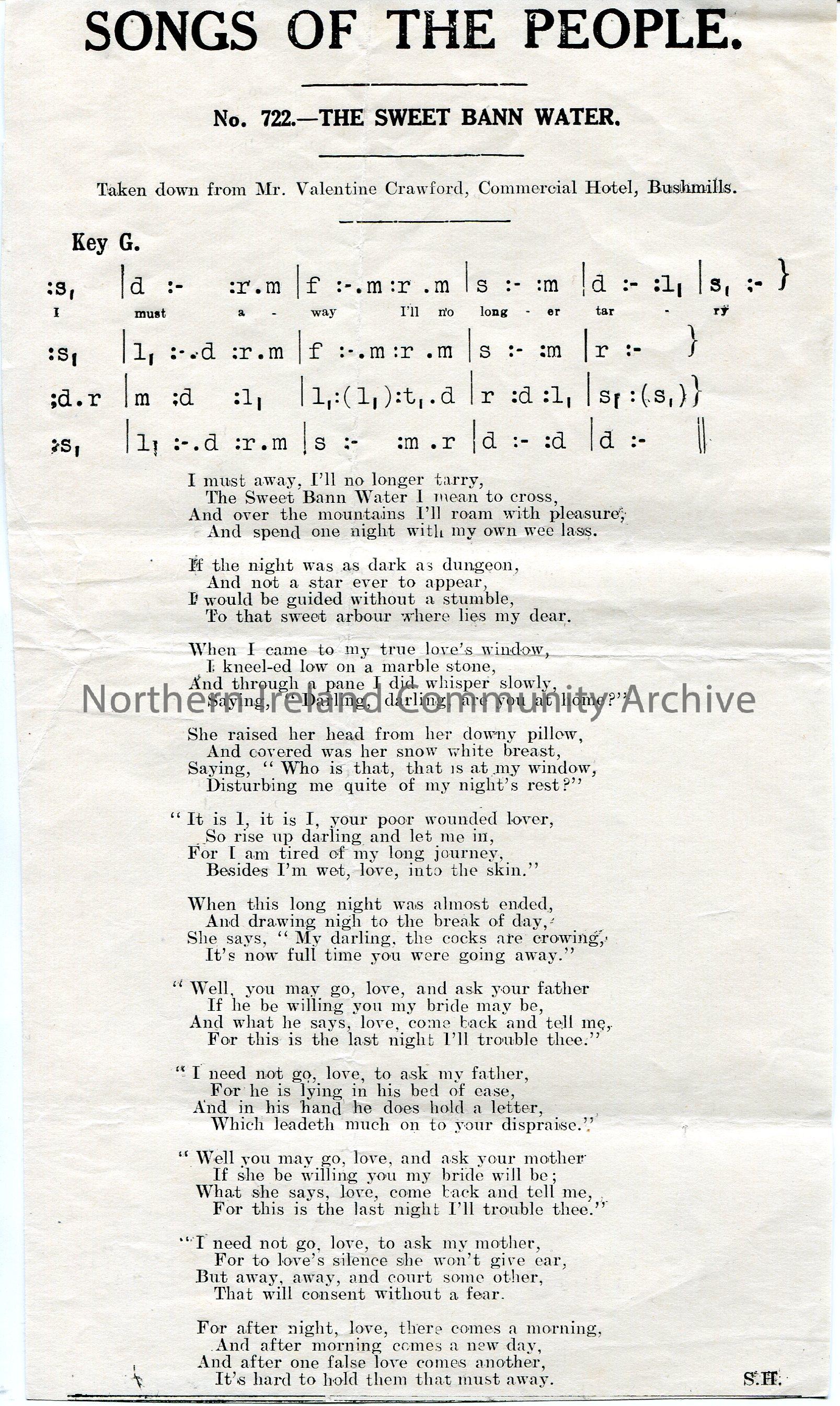 Printed tonic sol-fa notation and words to song titled, 'Songs of the People. No. 722. The Sweet Bann Water'. Taken down from Mr Valentine Crawford, Commercial Hotel, Bushmills.