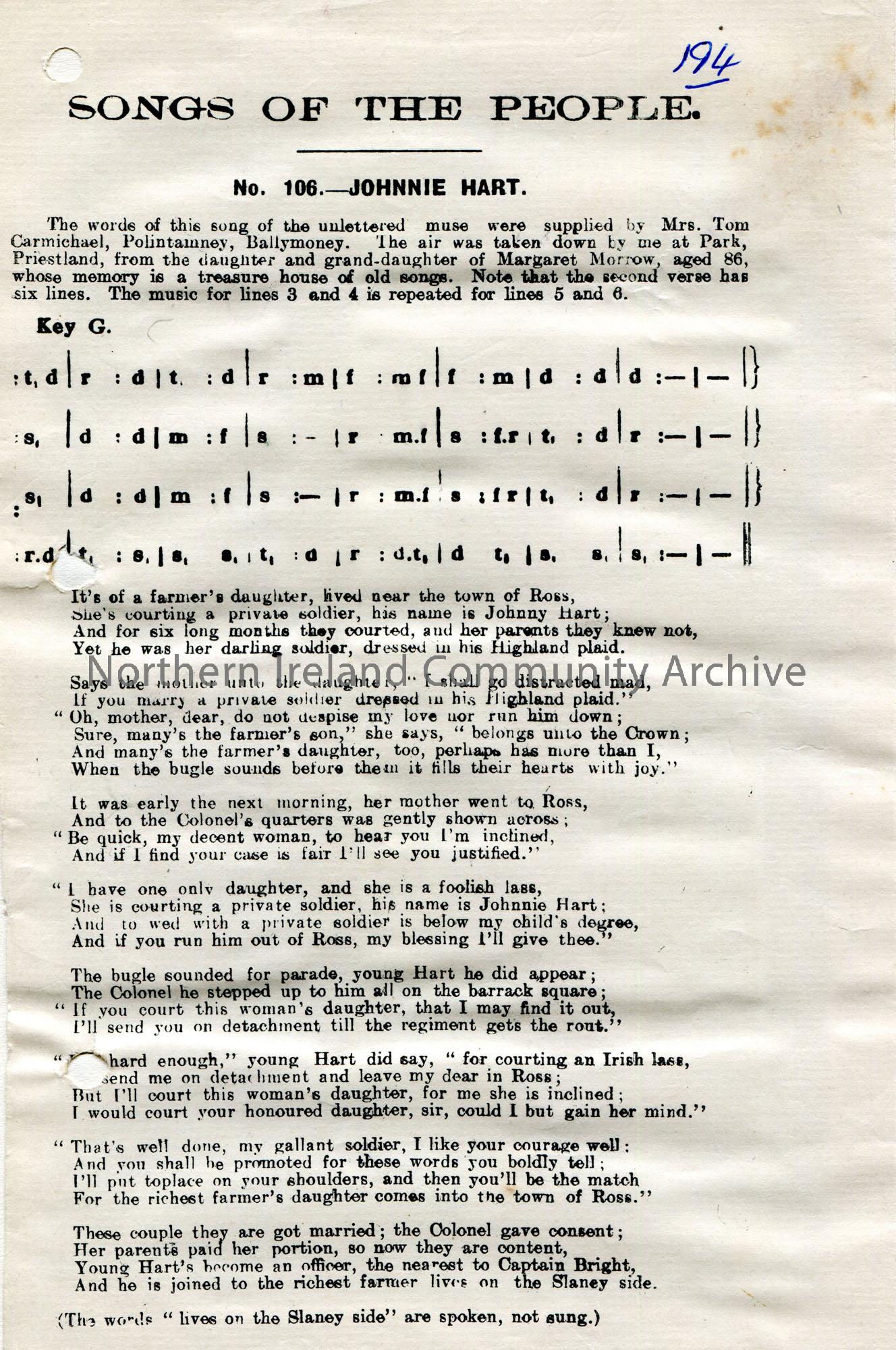 Printed version of a Songs of the People article. Tonic sol-fa notation and words to song titled, 'No. 106 - Johnnie Hart'. Words supplied by Mrs Tom Carmichael, Polintainney, Ballymoney. Air taken down by Sam Henry at Park, Priestland, from the daughter and granddaughter of Margaret Morrow.