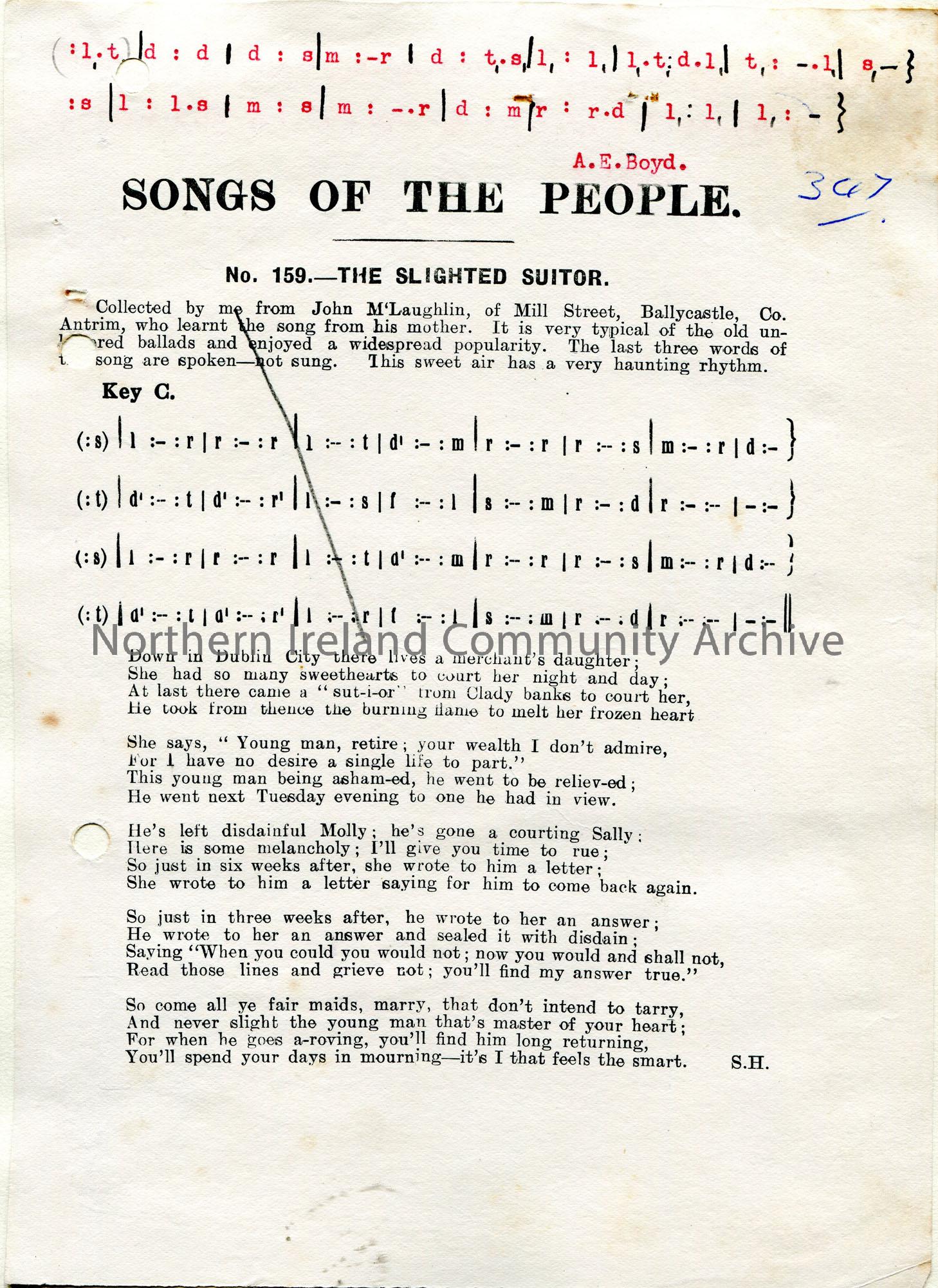Printed version of a Songs of the People article. Tonic sol-fa notation and words to song titled, 'No. 159 - The Slighted Suitor'. Collected by Sam Henry from John M'Laughlin of Mill Street, Ballycastle, who learnt the song from his mother. Tonic sol-fa is scored out. Another is typed in red top of page attributed to A. E. Boyd.