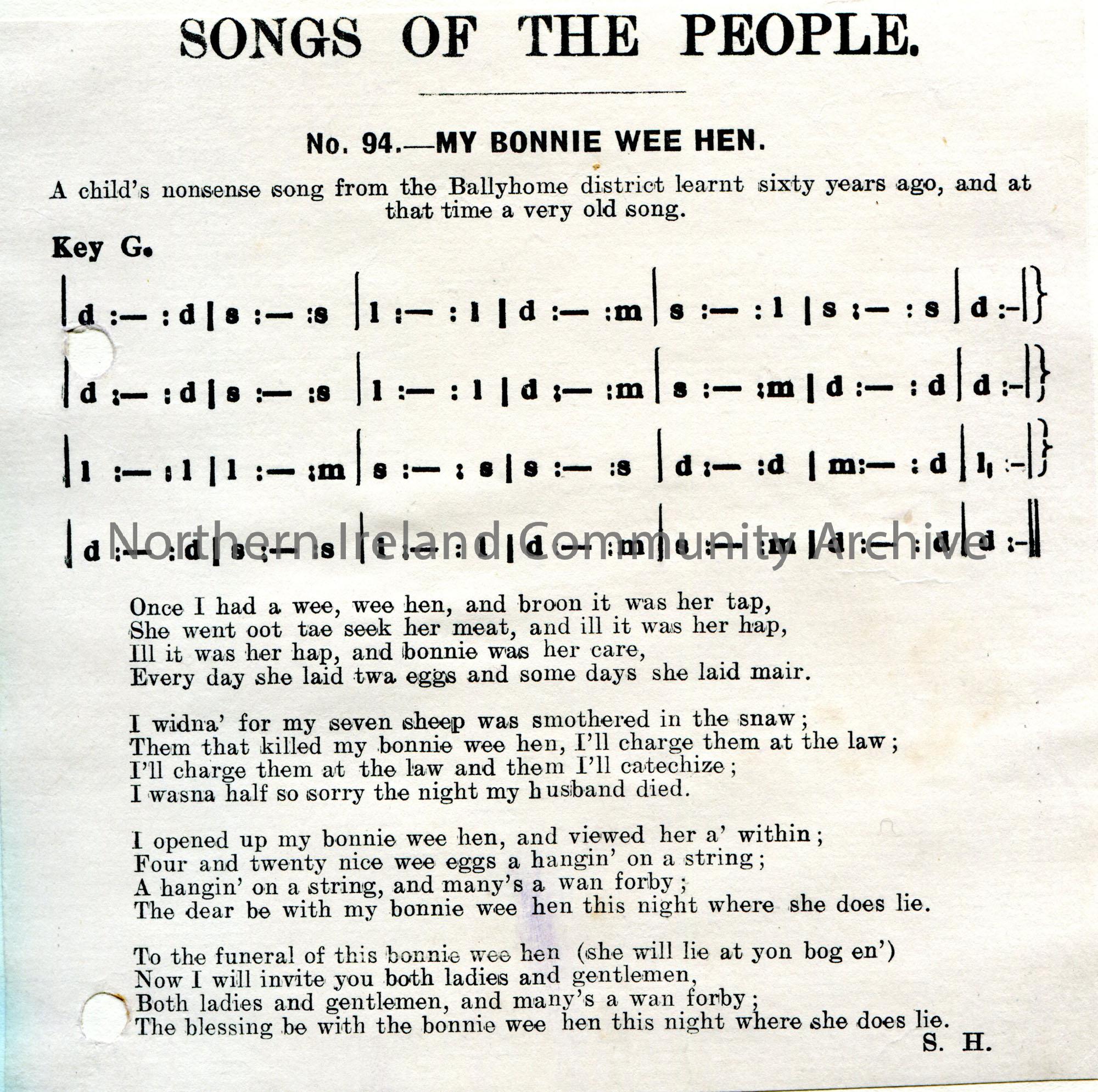Printed version of a Songs of the People article. Tonic sol-fa notation and words to song titled, 'No. 94 - My Bonnie Wee Hen'. A child's song from the Ballyhome district.