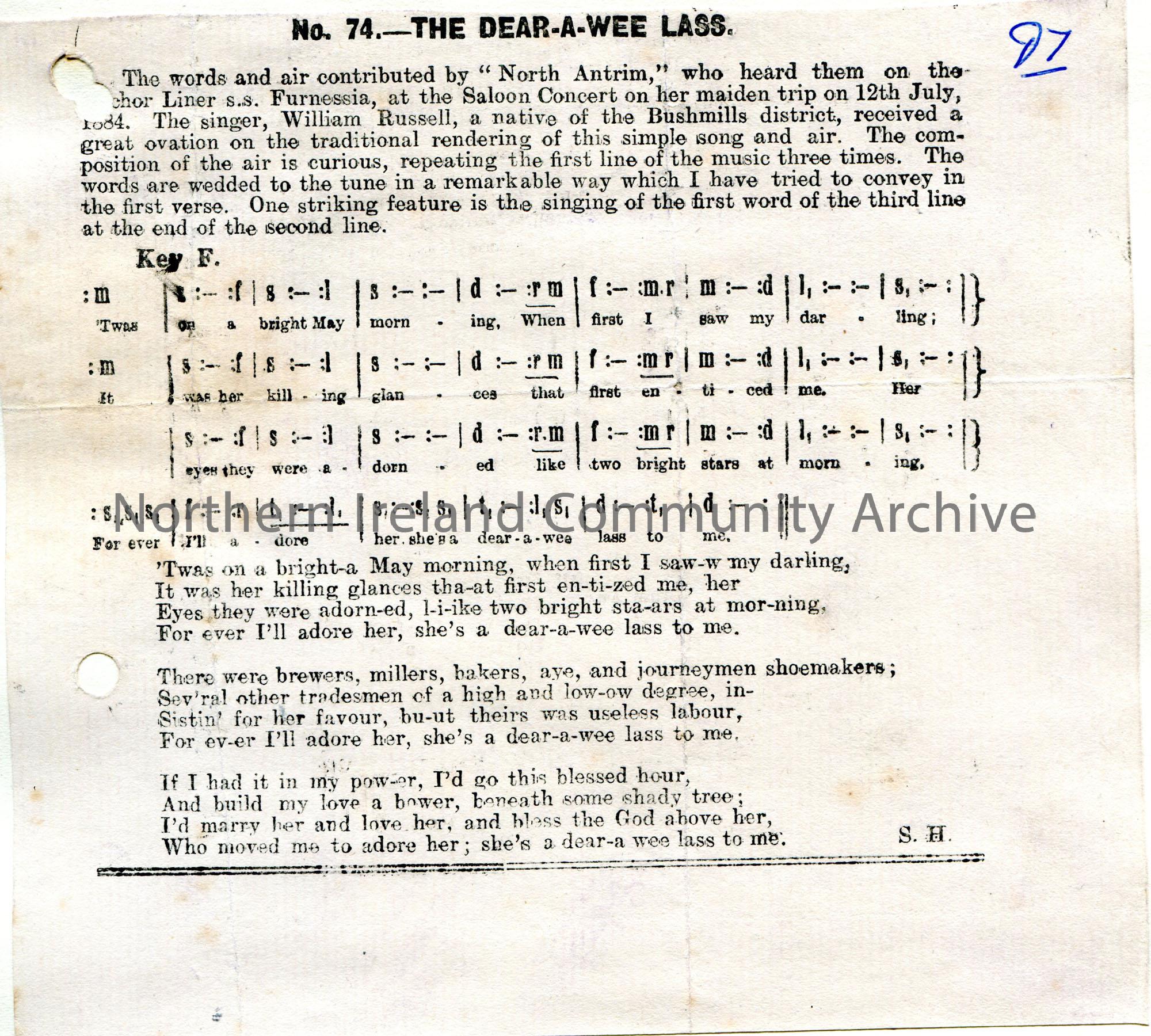 Printed version of a tonic sol-fa notation and words to song titled, 'No. 74 - The Dear-a-Wee Lass'. Words and air contributed by 'North Antrim' who heard them on the Anchor Liner s.s. Furnessia, 12th July 1884. The singer was William Russell of Bushmills.