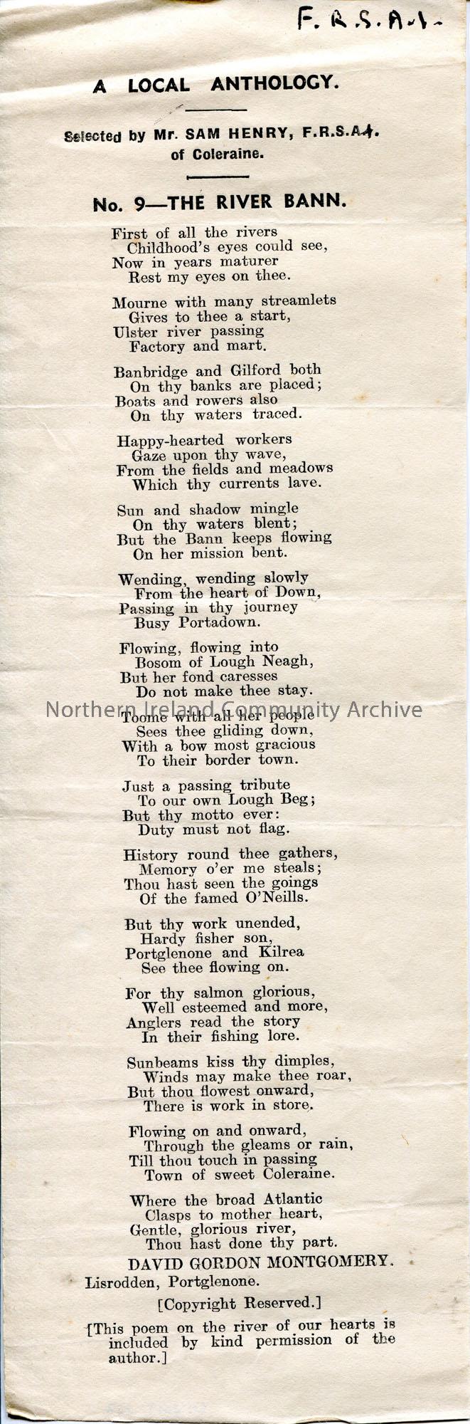 Printed version of an article column 'A Local Anthology. Selected by Mr Sam Henry, F.R.S.A.I., of Coleraine. No. 9 - The River Bann'. Provided by David Gordon Montgomery of Lisrodden, Portglenone. 'F.R.S.A.I' handwritten in black in at top of page.