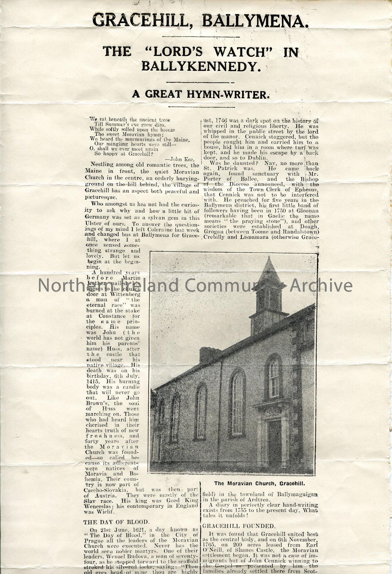 Printed version of article (part missing) titled, ‘Gracehill, Ballymena. The “Lord’s Watch” in Ballykennedy; A Great Hymn-Writer’. Re history of Grace…