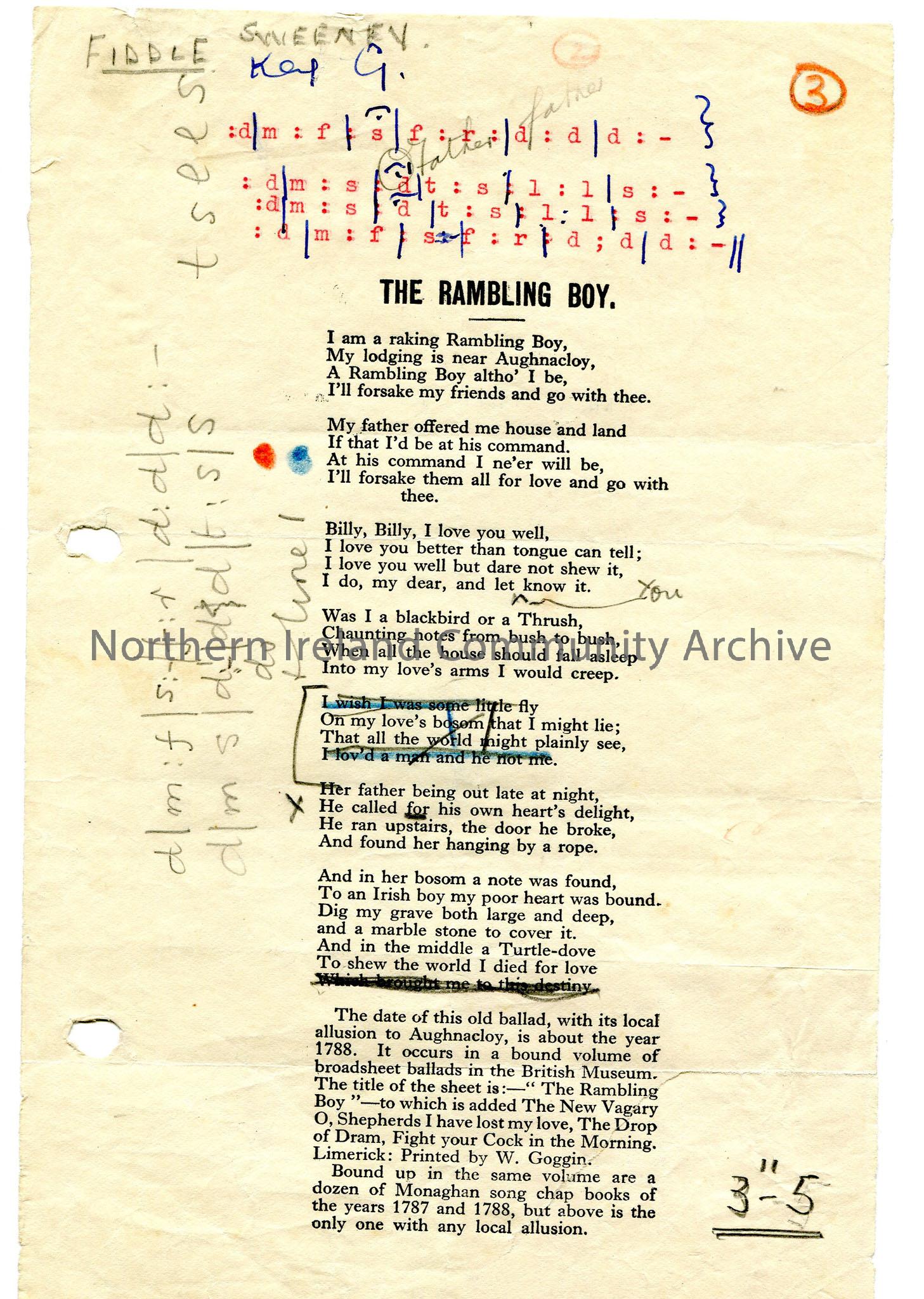 Printed version of ‘The Rambling Boy’, with superimposed typed and handwritten tonic sol-fa notation. Mentions Aughnacloy. Explanatory note dates ball…
