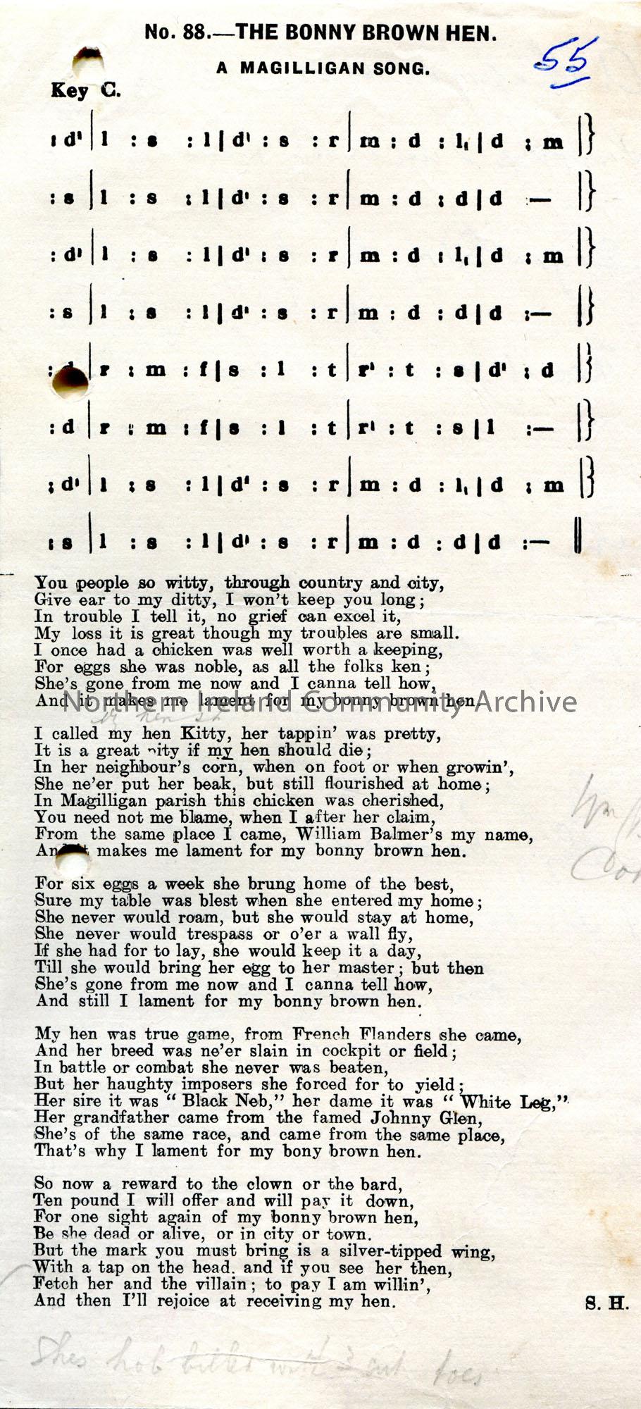 Printed version of tonic sol-fa notation and words to song titled, ‘No. 88 – The Bonny Brown Hen. A Magilligan Song’.