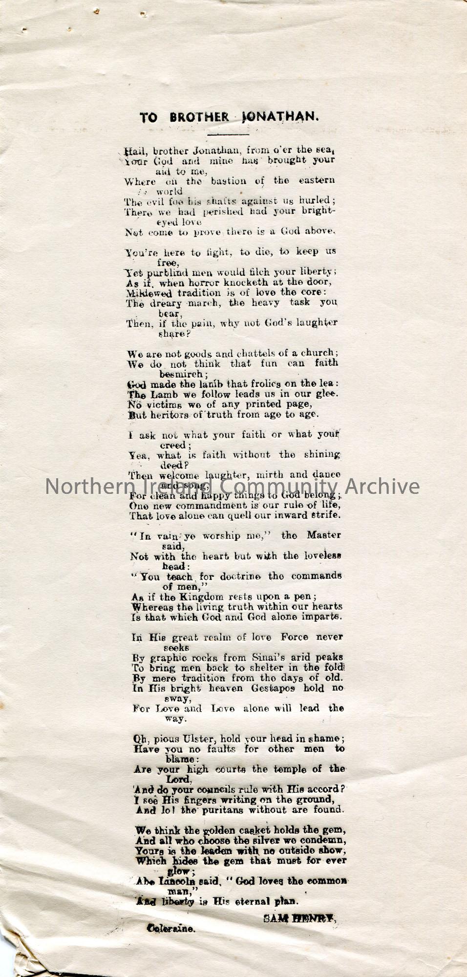 Printed version of words to poem or song ‘To Brother Jonathan’ by Sam Henry, Coleraine.