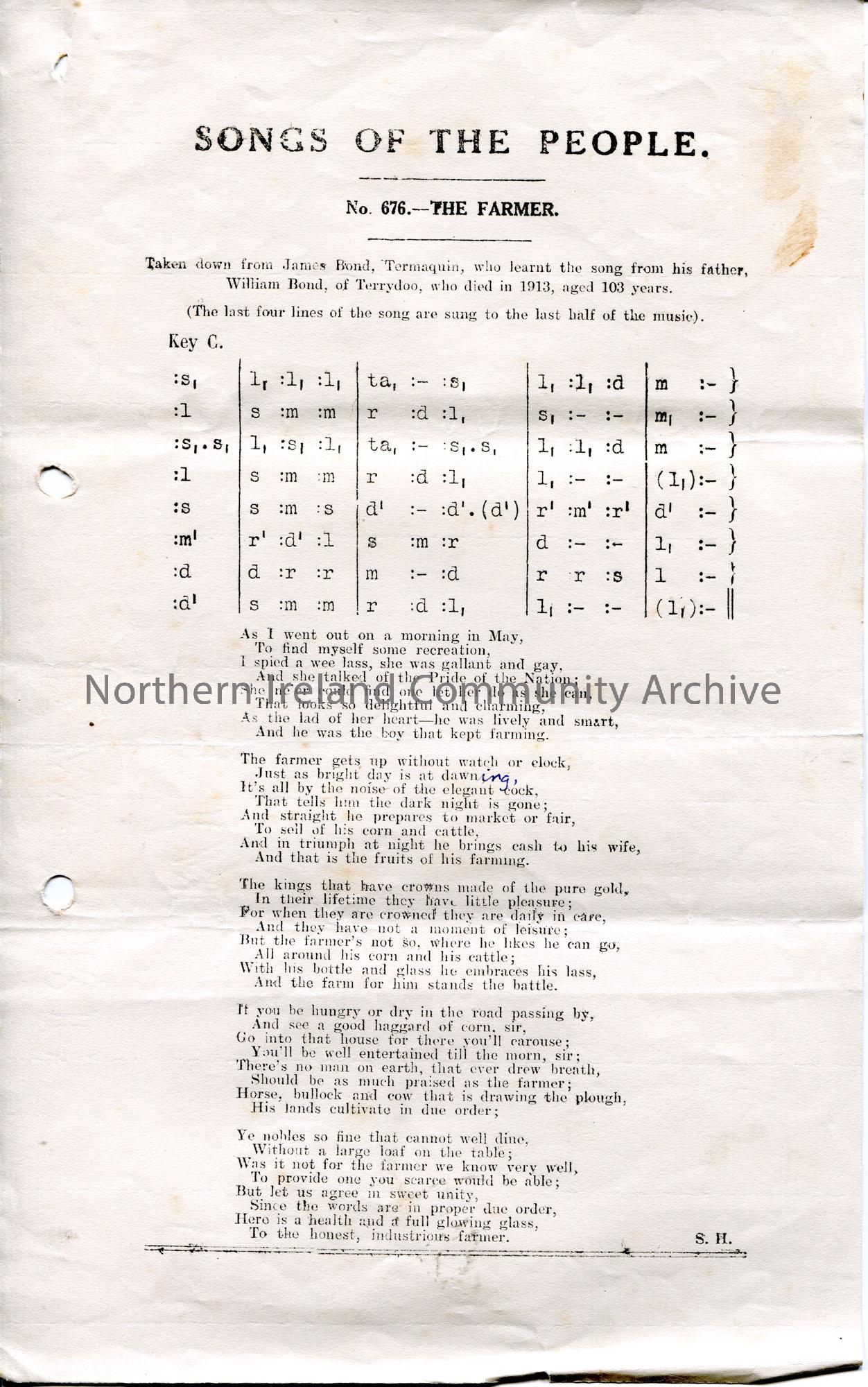 Printed version of words to song and tonic sol-fa to 'The Farmer'. Taken down from James Bond, Termaquin, who learnt the song from his father, William Bond, of Terrydoo, who died 1913 aged 103.