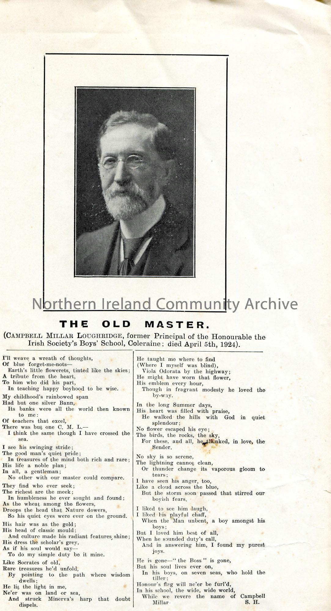 Printed words of a poem and photographic image of Campbell Millar Loughridge, former Principle of the Honourable the Irish Society's Boys' School, Coleraine. Titled, 'The Old Master'. S.H. initials in bottom corner.