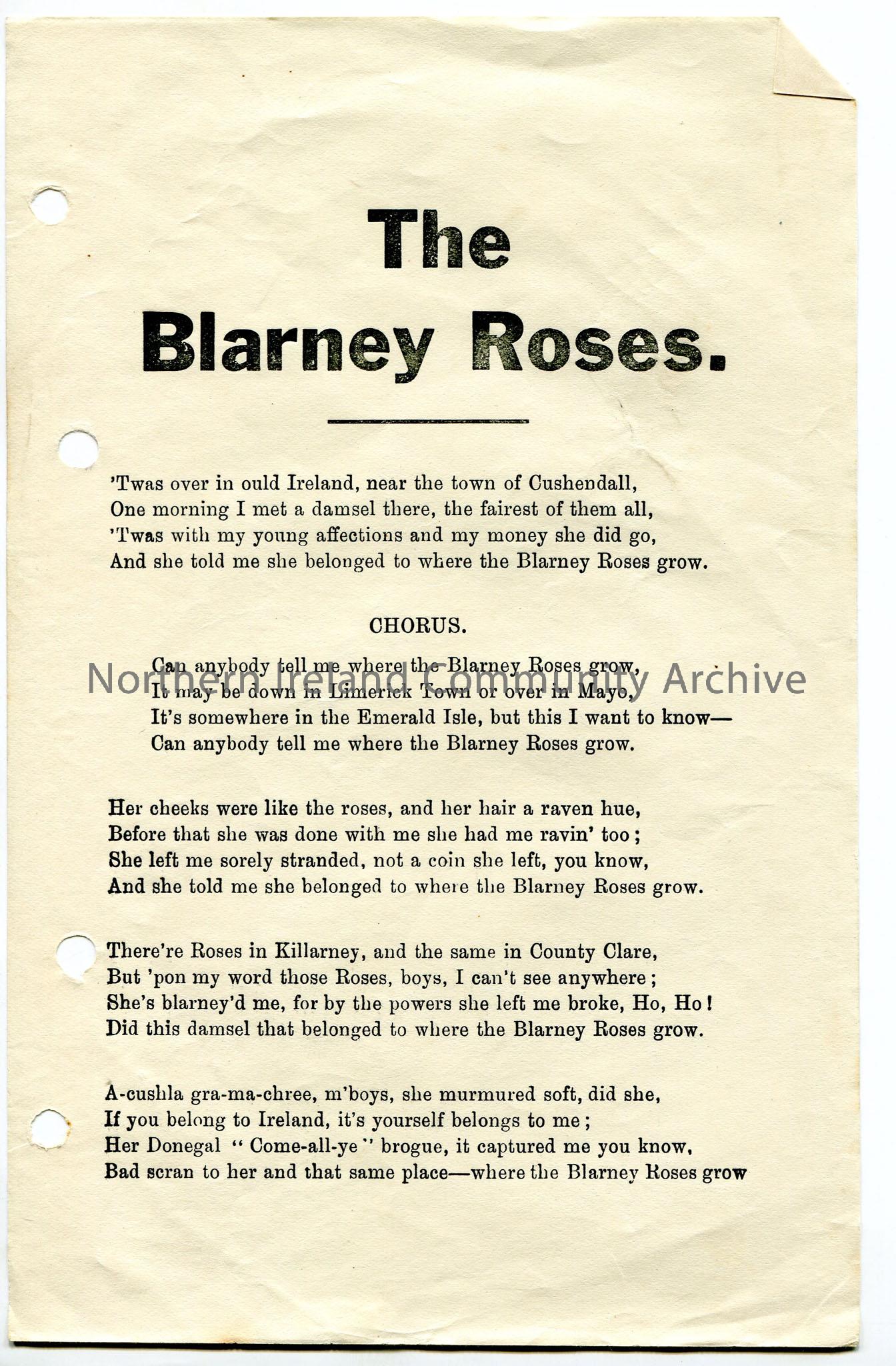 Printed words to ‘The Blarney Roses’. Uses local dialect. Mentions Cushendall, Tralee, Killarney and Donegal.