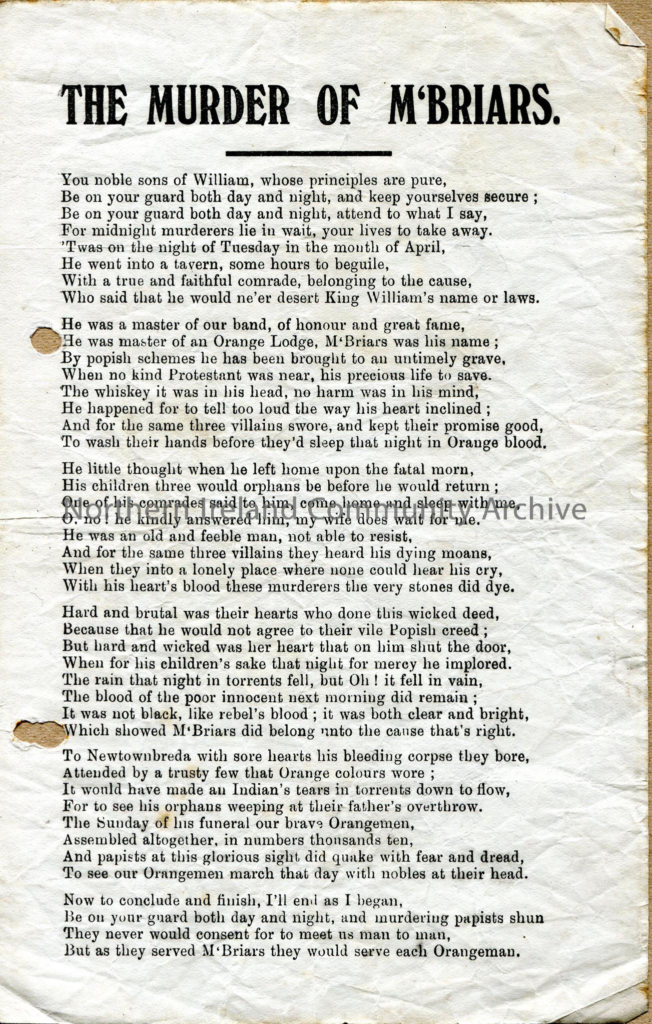 Printed words to ‘The Murder of McBriars’ – refers to ‘brave Orangemen’ and ‘vile Popish creed’.