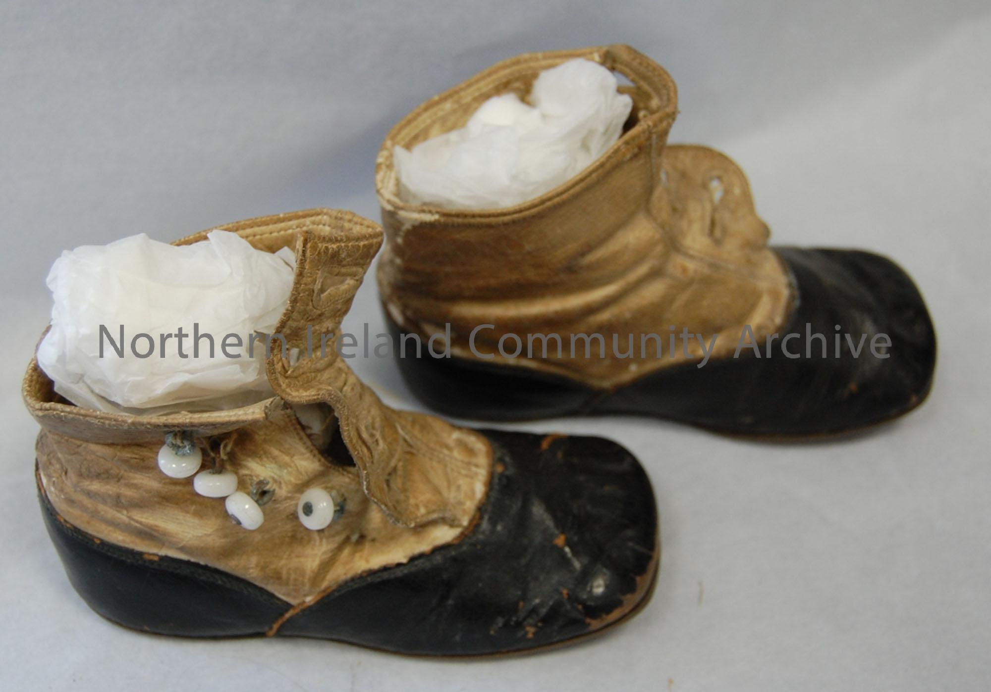 Probably late 19th century, made of black and cream coloured leather with white glass button fasteners; made to imitate the adult fashion of the time;…