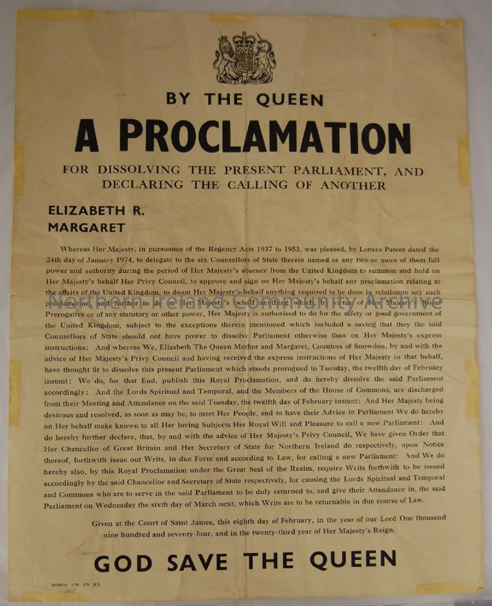 Proclamation for dissolving Parliament. Dissolution of Parliament by the Queen, 8 February 1974